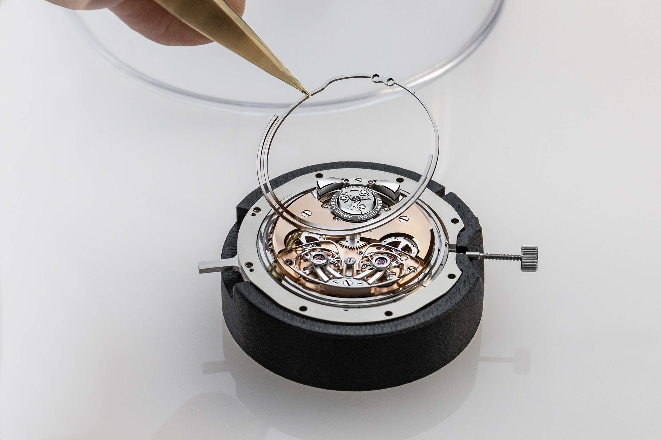 Design is pared back without losing character. The display is centred, the architecture openworked yet calmer, with softer lines and clear hierarchy: resonance system, quartet of hammers and gongs, and the governor. It feels considered rather than crowded.