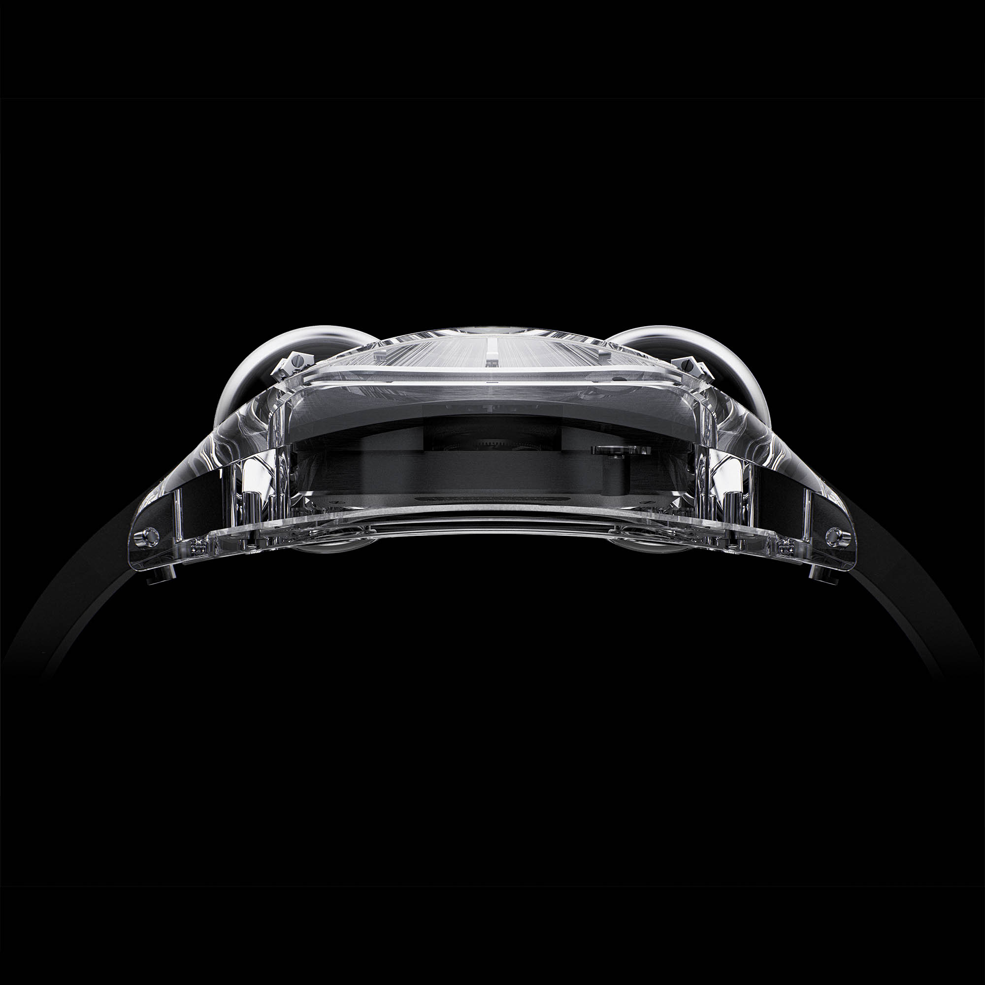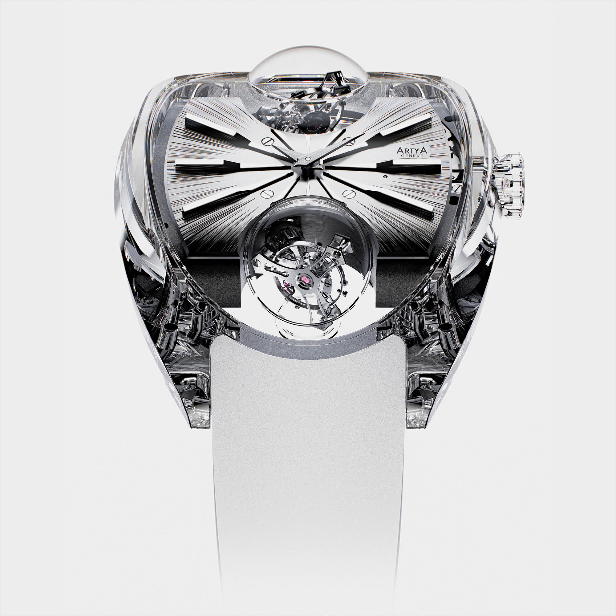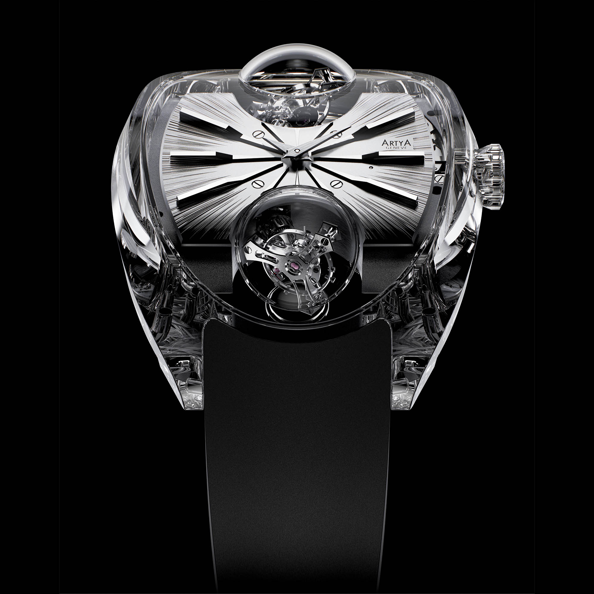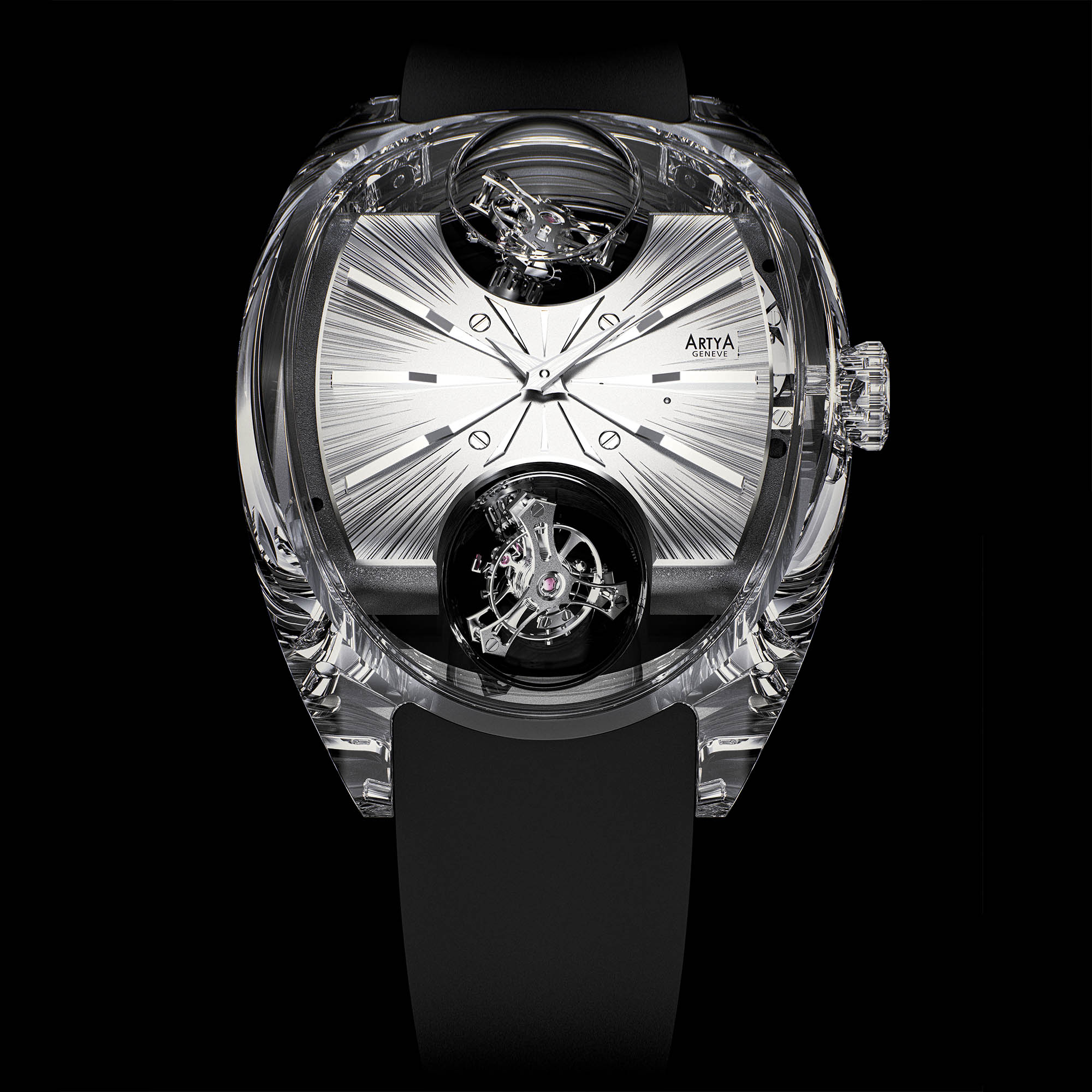 Two dial personalities frame the spectacle. Griffe uses a rhodium black treatment with point-cloud engraving that throws light in every direction, indices mirror polished for contrast. Matte opts for uniform shot blasting and a quiet, mineral calm. Both are offered in Anthracite or Silver, paired to either transparent sapphire or Pigeon’s Blood Ruby cases, each on an integrated rubber strap.