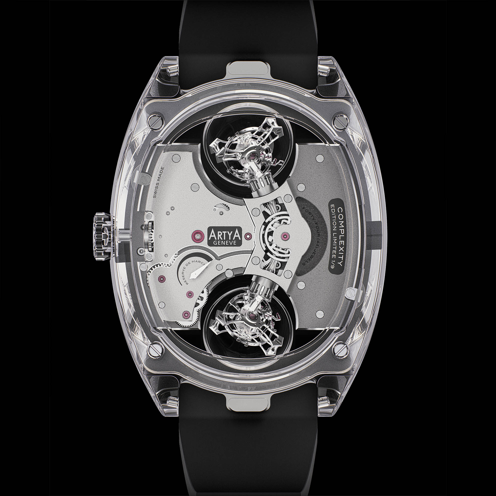 ArtyA unveils the Complexity at Watches & Wonders 2026, a world premiere limited to 9 pieces. Two inclined tourbillons set at 12H and 6H work through a differential inside a fully transparent sapphire case or a deep red synthetic ruby case. It is an unabashed mechanical statement, but one with purpose.