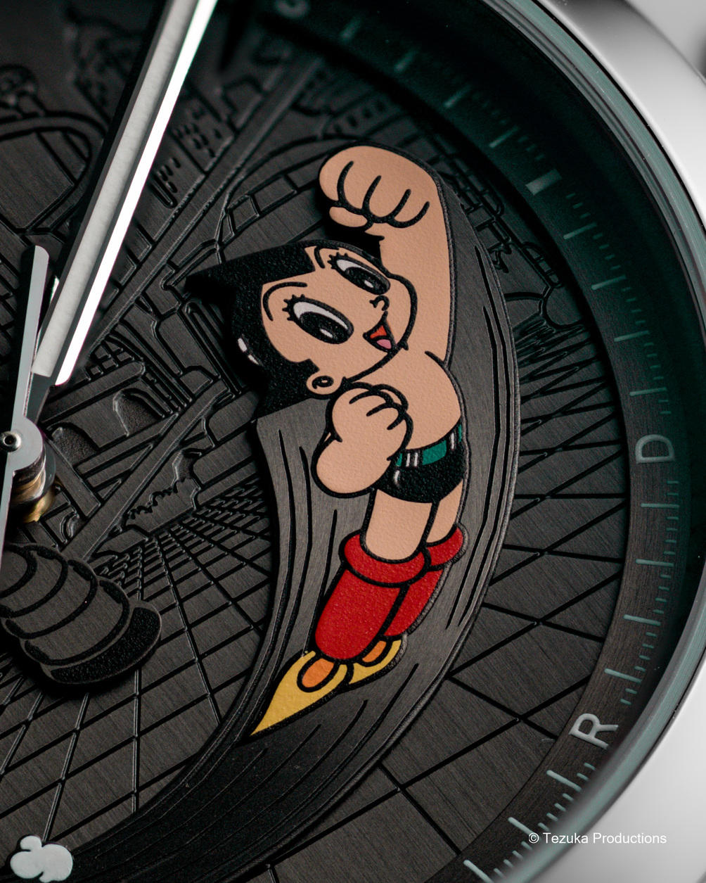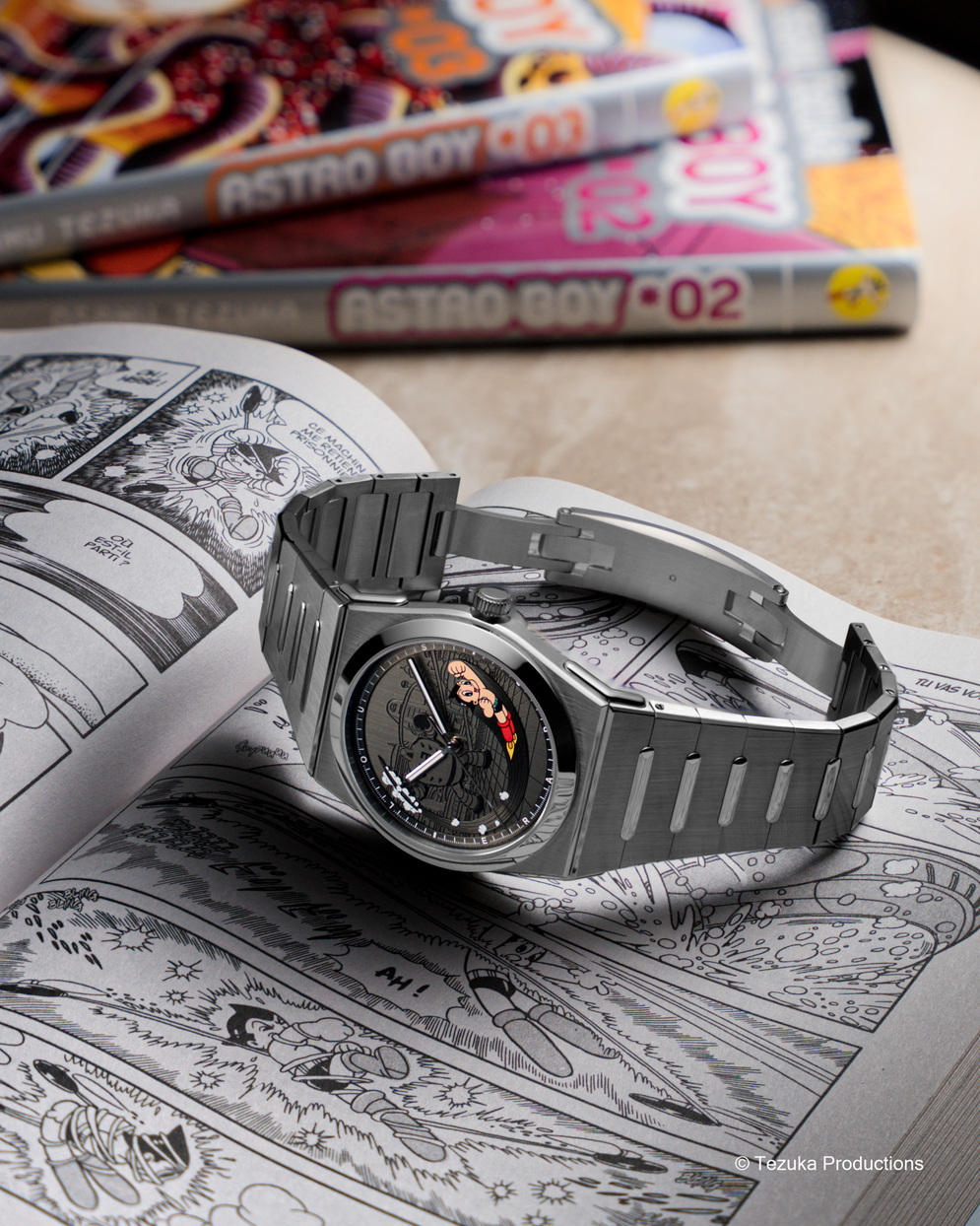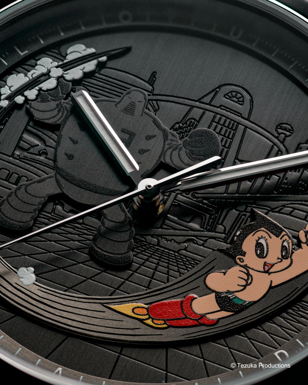 The watch case, crafted in satin-finished titanium and stainless steel, feels like it was built for superheroes with its slim profile and robust practicality. The Astro Boy model stakes its claim in pop culture and watch history with a cinematic dial layout that sets the scene for Astro Boy and a lurking villain, enhancing the feeling of adventure every time you check the time.