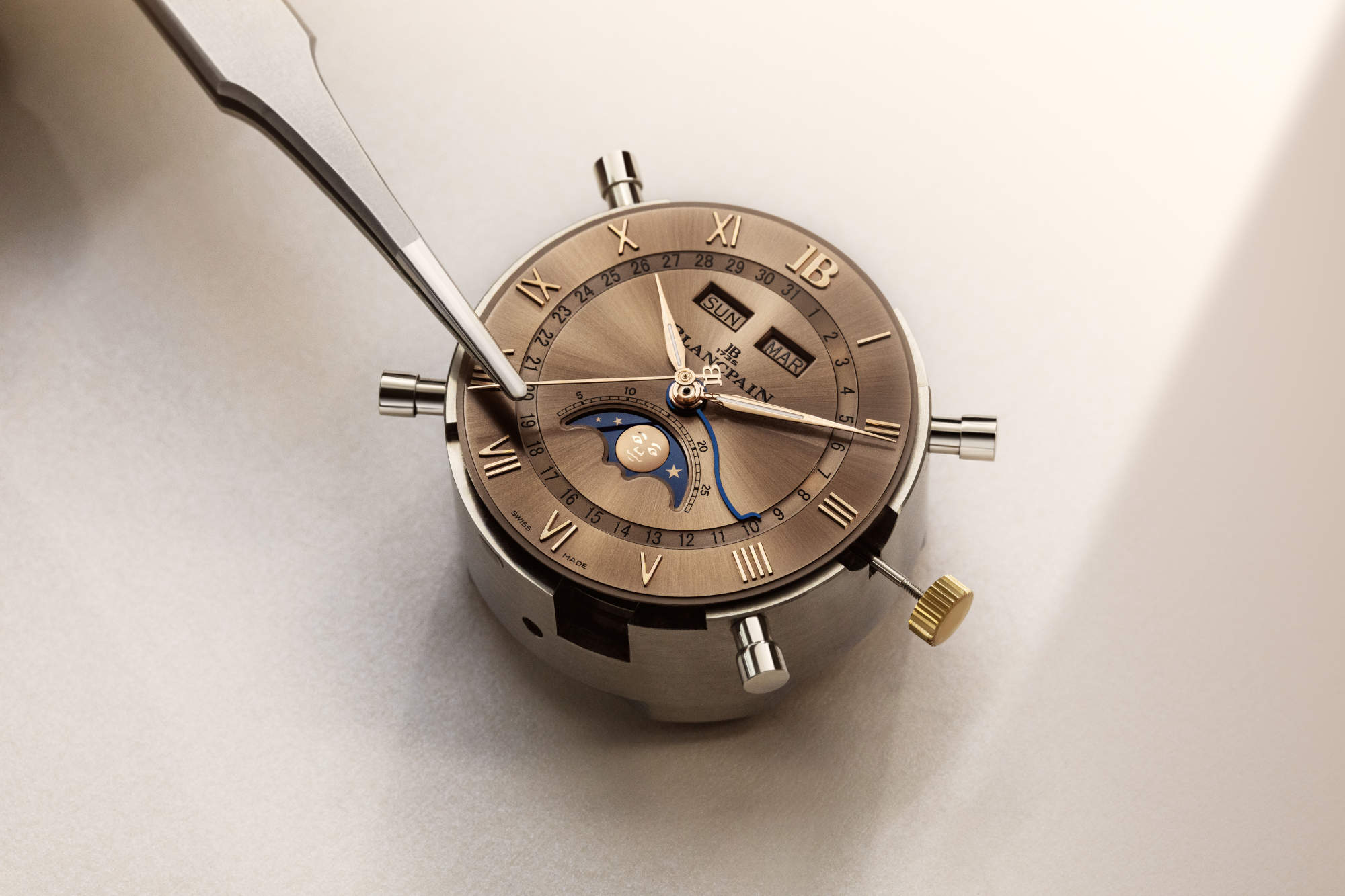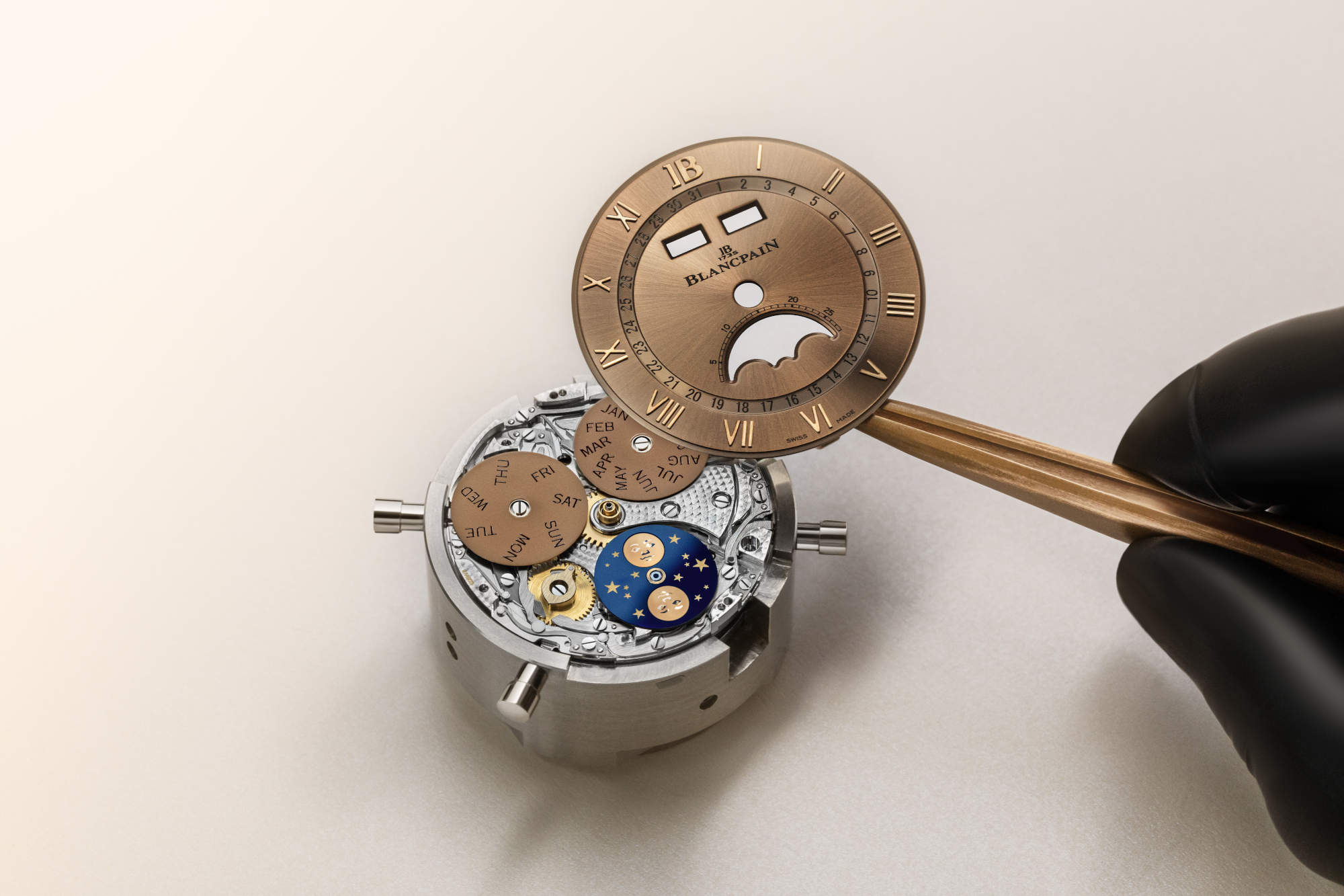 The moon phase is the signature. Blancpain keeps the familiar Mona Lisa smile, now rendered as a solid 18k gold domed applique. Set on a blue ceramic disc with a newly arranged star field, it offers high contrast and improved legibility. The enlarged aperture is not drama, just clarity.