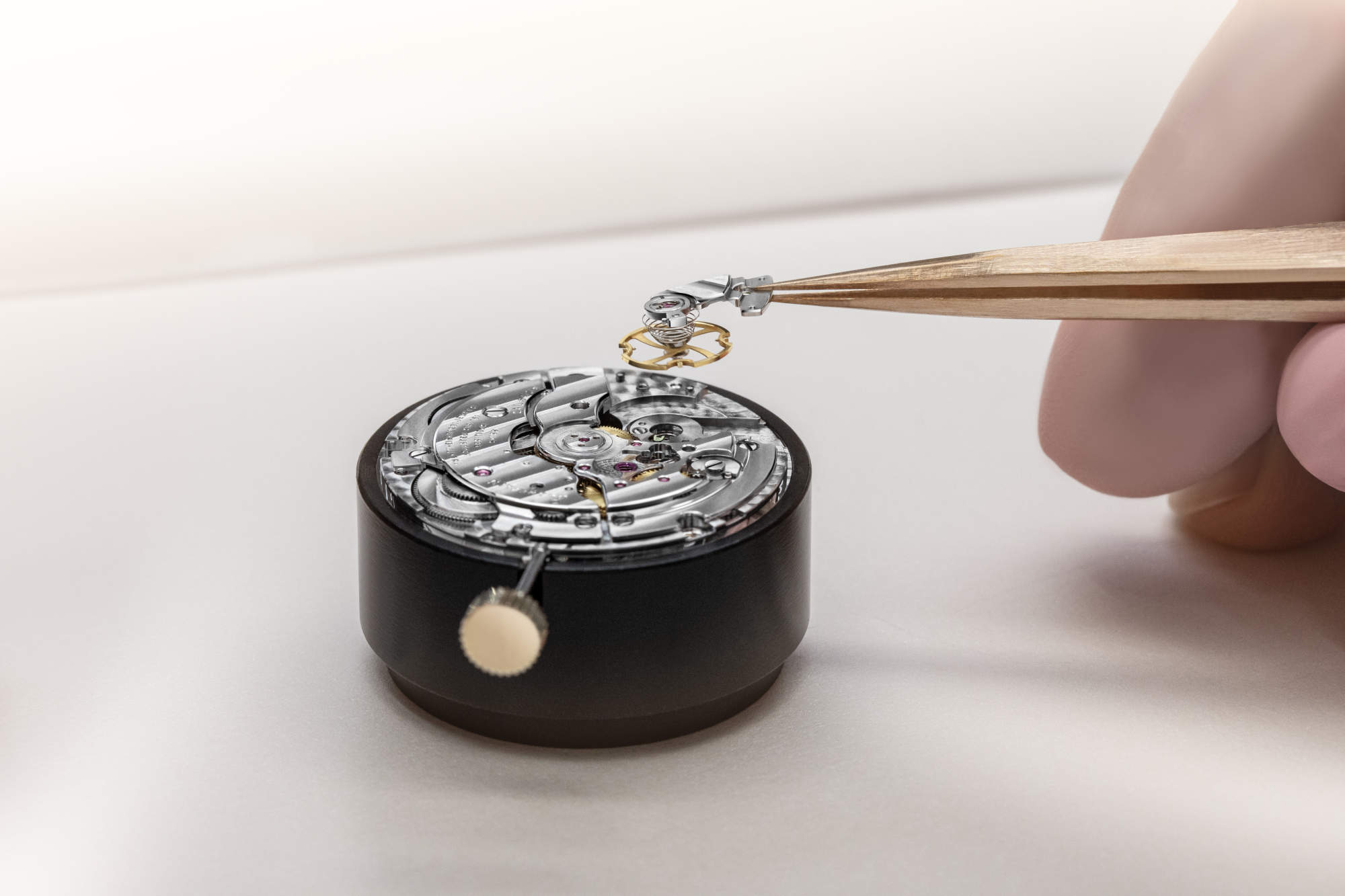 The dial earns its depth, not with lacquered rhetoric, but with process. Five successive baths – two washing stages, then three galvanic – build a deep, even tone. The final galvanic bath uses gold superior to 18 carats, lending quiet richness. A sunray finish animates the surface, tempered by a contrasting date ring. Each dial meets strict thickness and flatness criteria and is checked eight times by a human eye and hand.