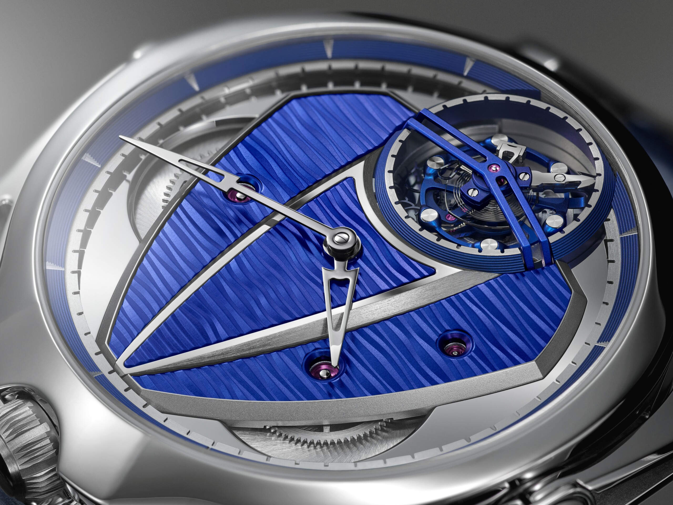 Legibility is treated with the same discipline. Whitened hour markers and polished titanium hands play against a blued microlight hours track, with circular satin-finished minutes and seconds tracks. The result is depth without clutter – a layered dial that reads at a glance.