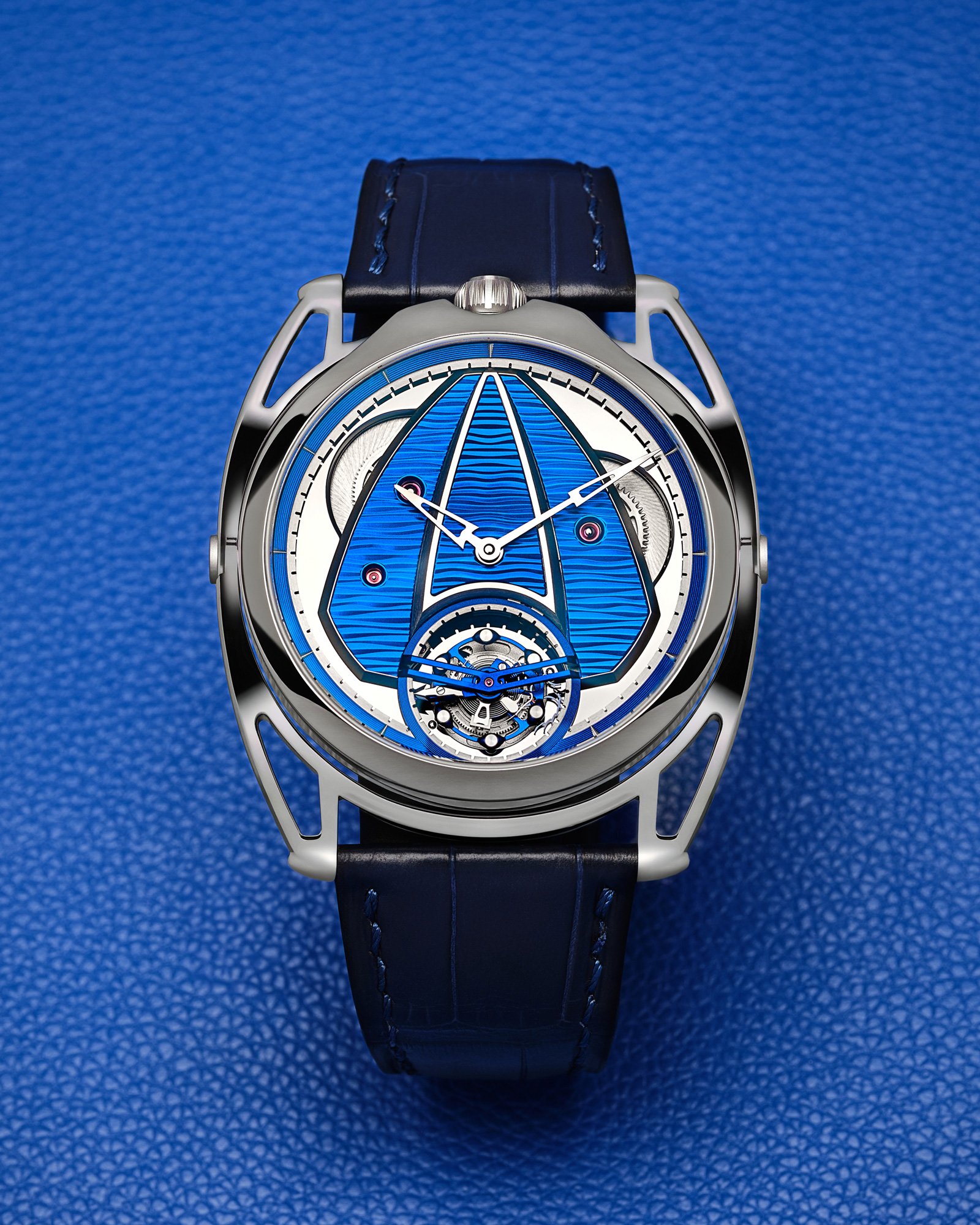 De Bethune’s DB28xs Sea Tourbillon brings the brand’s blue-tinged poetry into a 39 mm frame, pairing a high-frequency tourbillon with a dial of blued titanium worked in a random guilloché pattern. The surface shimmers like calm water disturbed by a breeze – aesthetic charm with mechanical purpose.