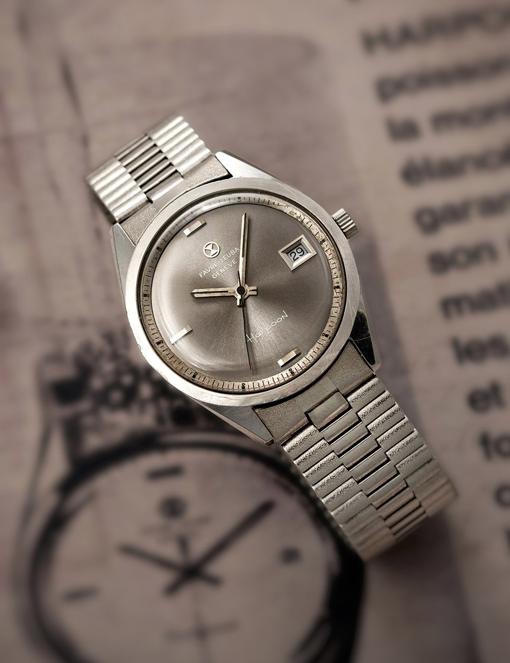 The Harpoon Revival returns to a 1966 design with uncommon restraint. A 36.8 mm stainless steel case and a slim 10 mm profile keep the proportions civil, while a closed caseback engraved with the historic medallion keeps the mood period correct. The gray sunray-brushed dial holds the line on character: horizontal markers at 12, 6, and 9, a framed date, and the historic “Harpoon” signature. Rhodium-plated hands with Super-LumiNova tip the balance toward real-world legibility.