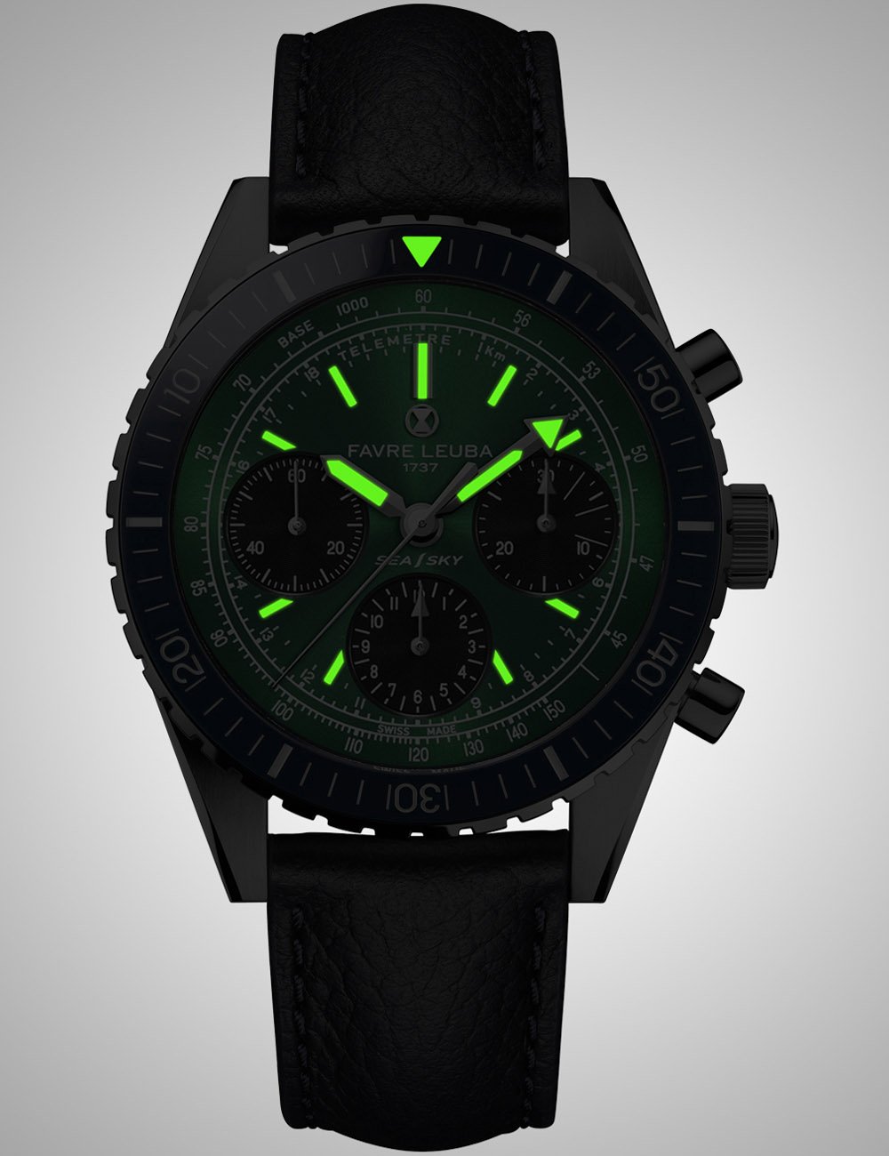 The watch’s radiant sunray finish and black sub-dials give the dial a dynamic look, creating an eye-catching contrast. With neo-vintage appeal, the dial features arrow-style hands and retro-inspired hour markers, all perfectly illuminated by Super-LumiNova® for readability no matter the lighting conditions. A telemeter and tachymeter scale circling the dial nod to the watch’s dual emphasis on style and functionality.