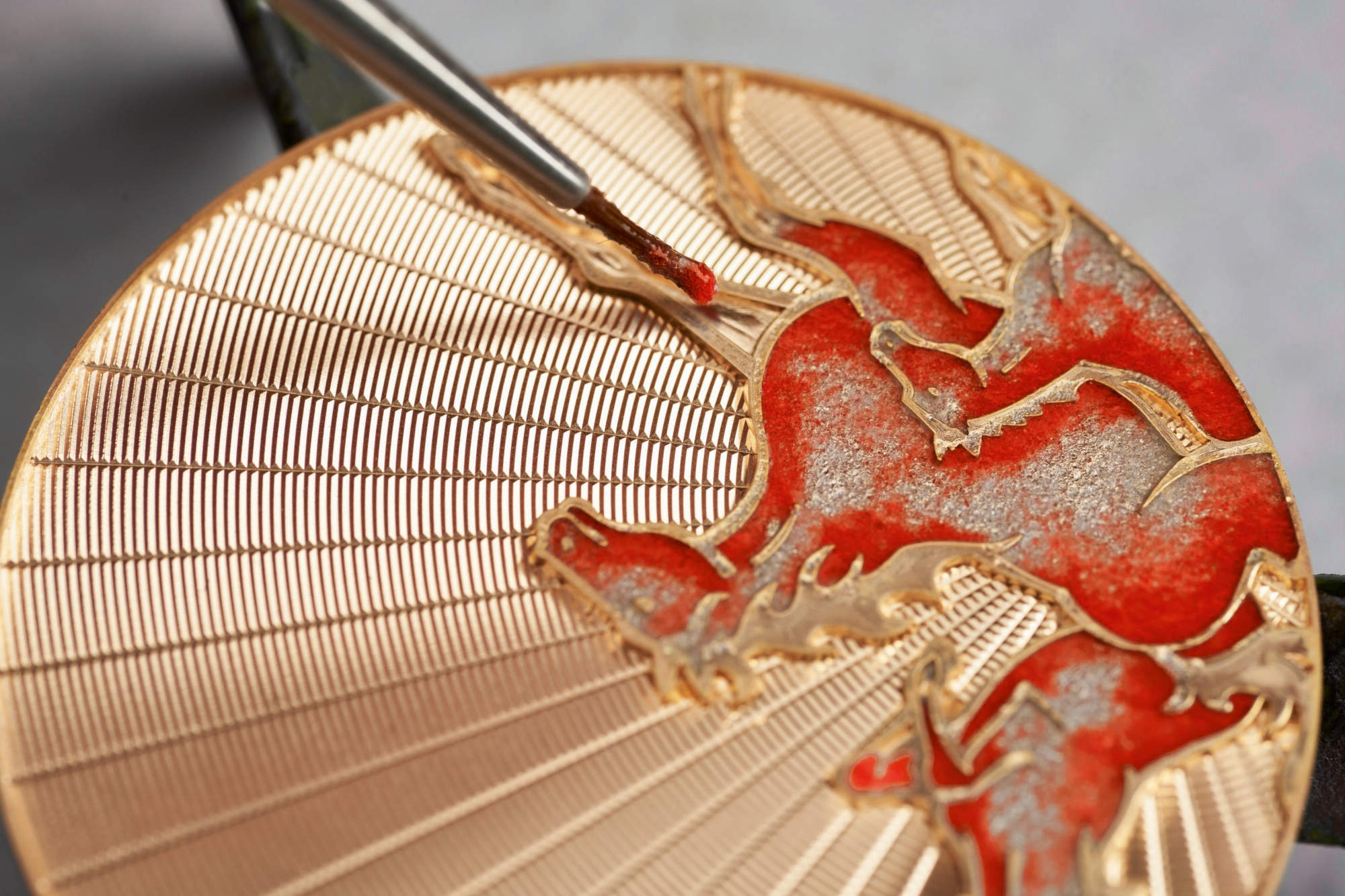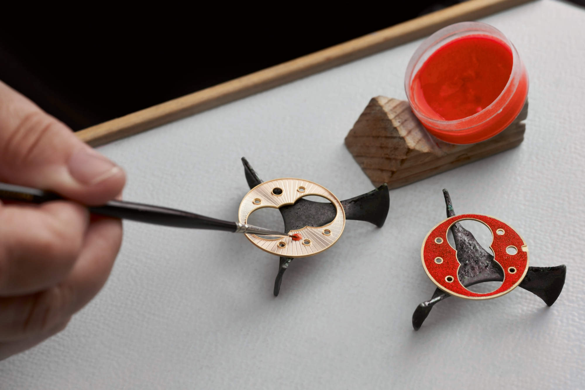 Housed in a 43 mm pink gold case, the watch revives the maison’s emblem the Three Gold Bridges in a matching hue, set against a red Grand Feu dial. Case, lugs, bezel and even the buckle are intricately engraved, a direct homage to the historic 1889 La Esmeralda pocket watch. The effect is ornate yet disciplined, like a cavalry parade that still minds its cadence.