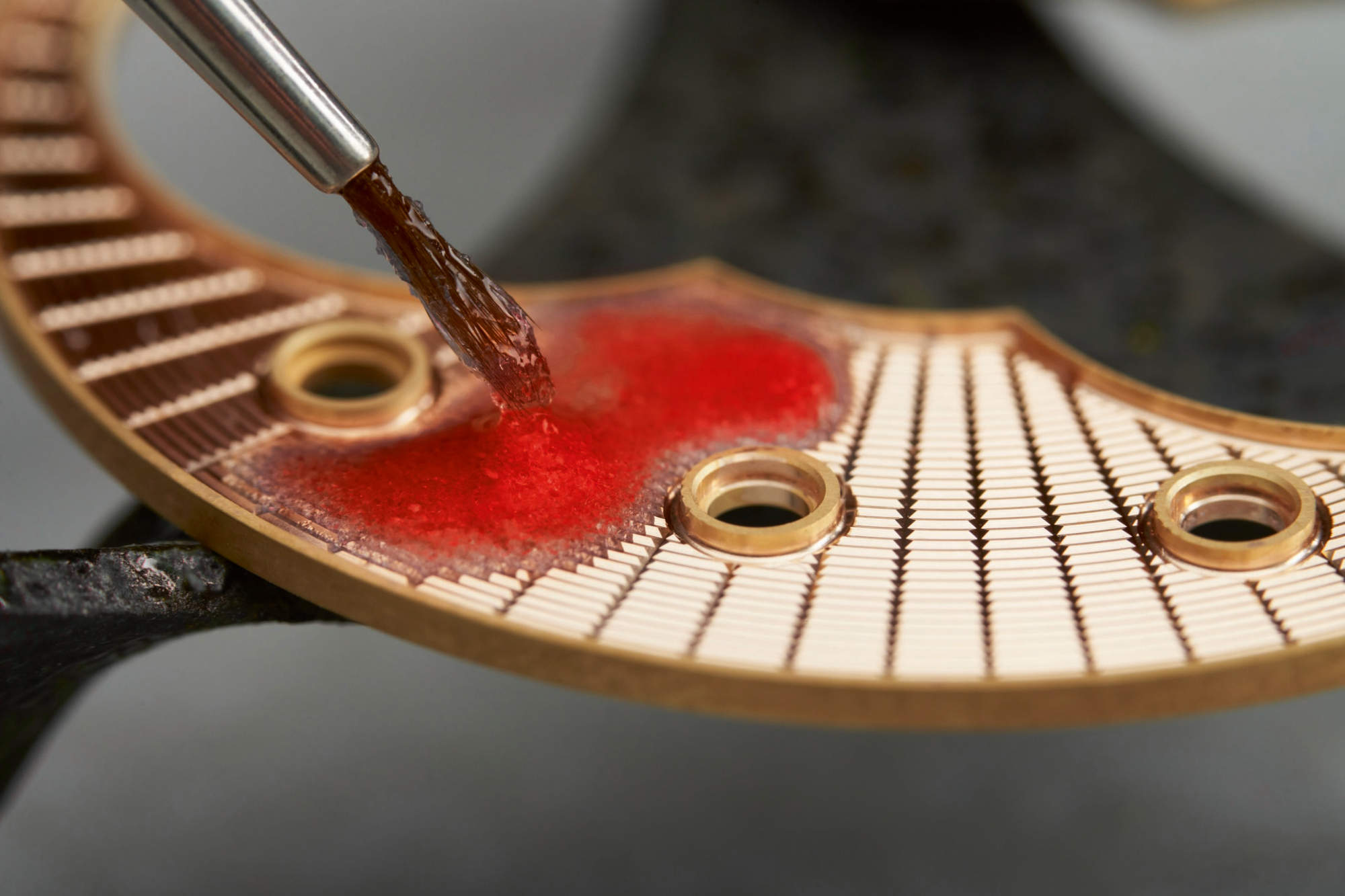 The dial pairs sunray and circular guilloché, applied by hand on a rose engine lathe. It catches light in calm waves rather than shouting for it. The red is auspicious, yes, but here it reads as intent more than spectacle.