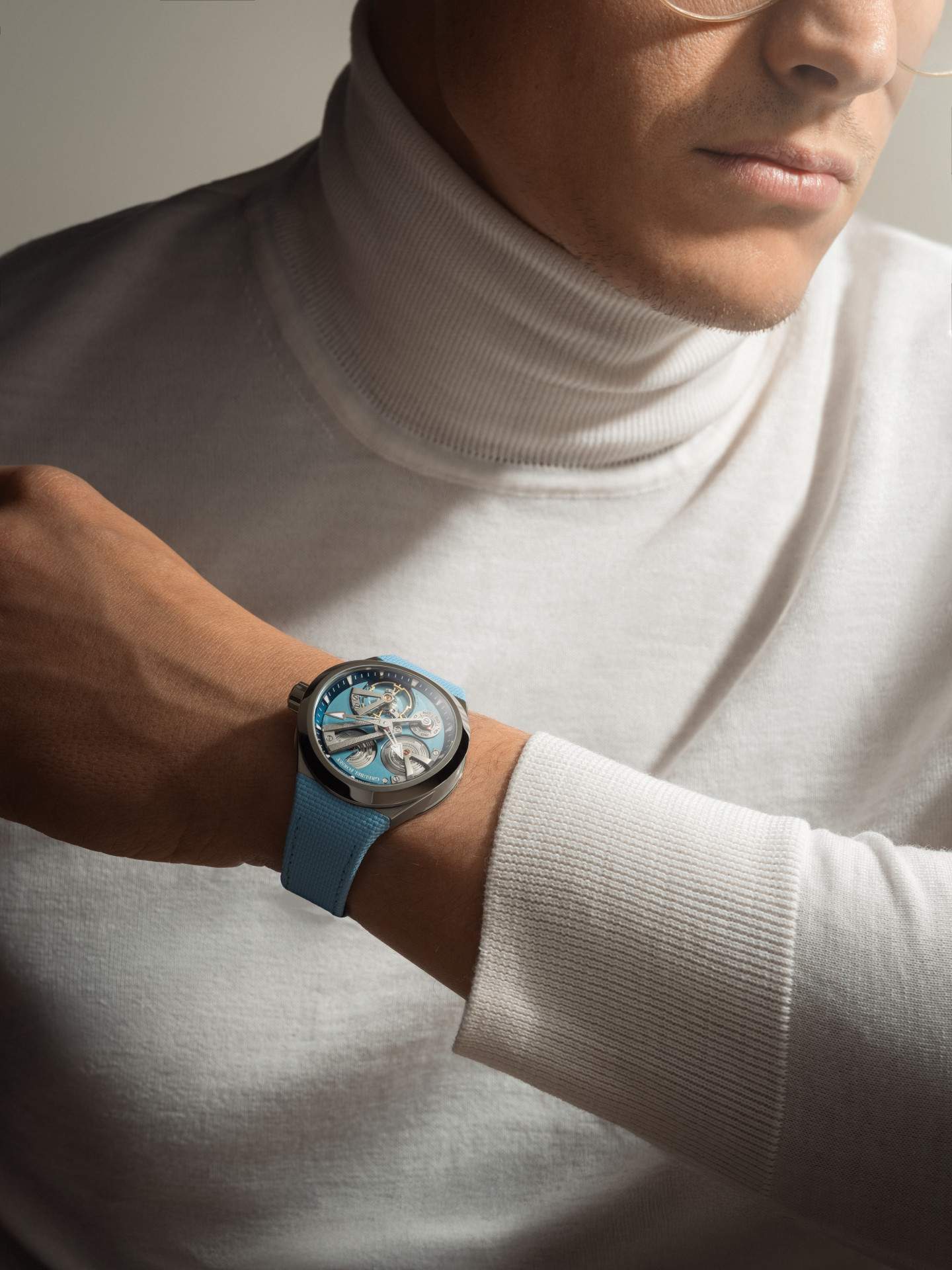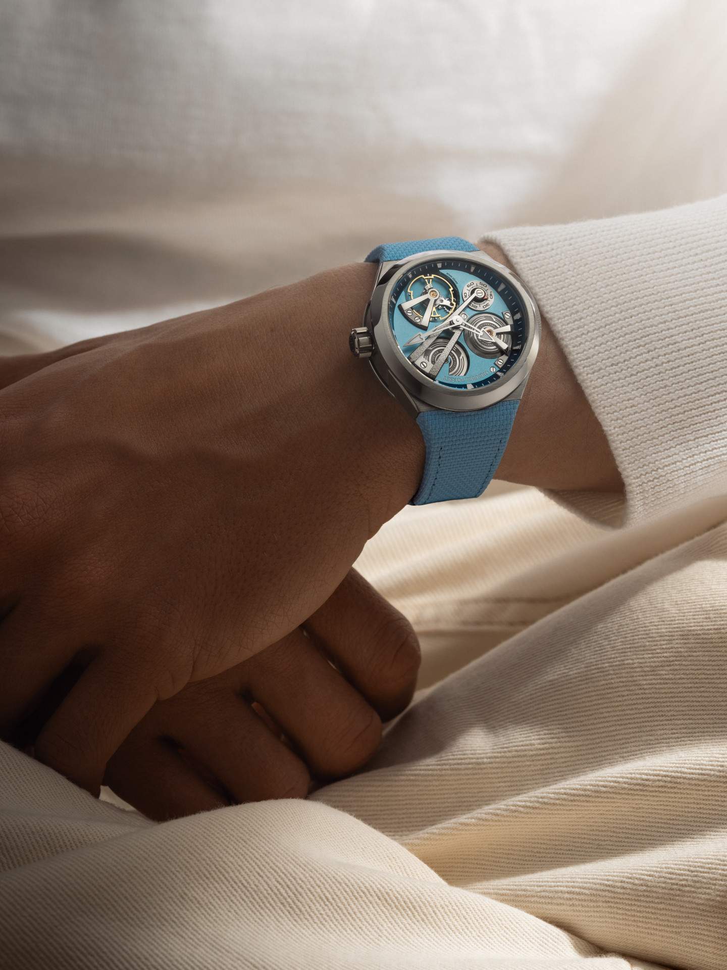 Color plays a supportive role. Multiple hues of blue guide the eye through levels, heightening legibility without theatrics. Hours and minutes sit on the suspended arch; small seconds are read via a rotating disc with a fixed red triangle; the power reserve appears on the movement side.