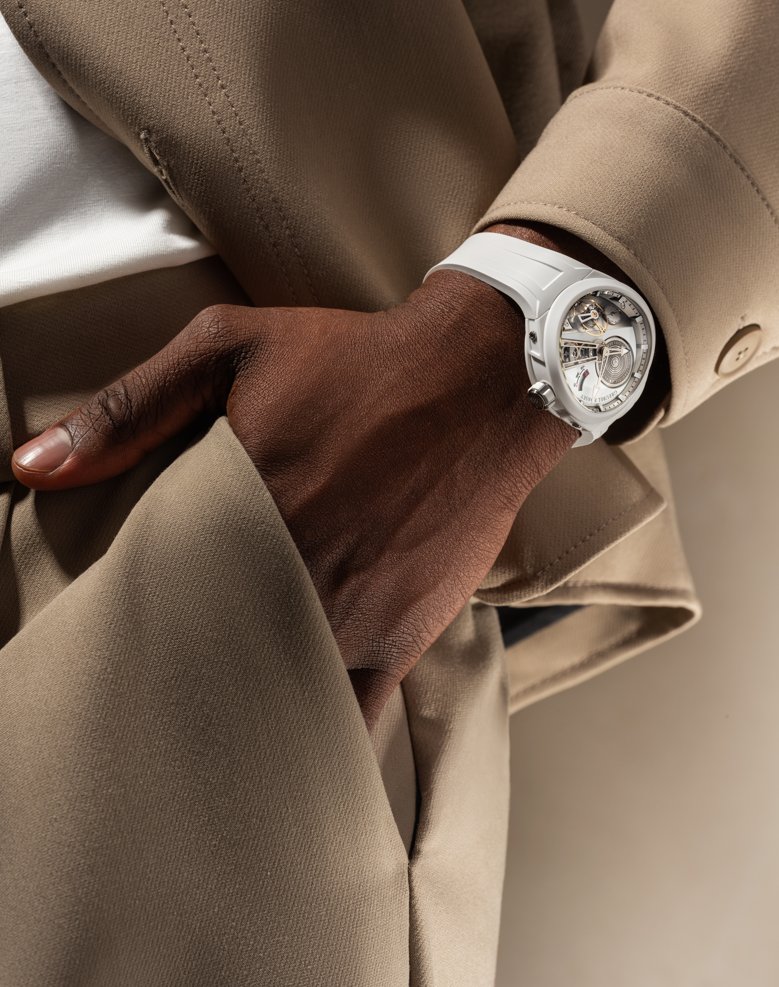 The black ceramic and 5N red gold edition plays with contrast and depth. Black treated components and ceramic surfaces frame the architecture, while red gold adds warmth and weight. Matte against polish underscores the relief of the Convexe form. The white ceramic edition takes the inverse route – light, graphic, and precise – letting structure speak through shadow and reflection.