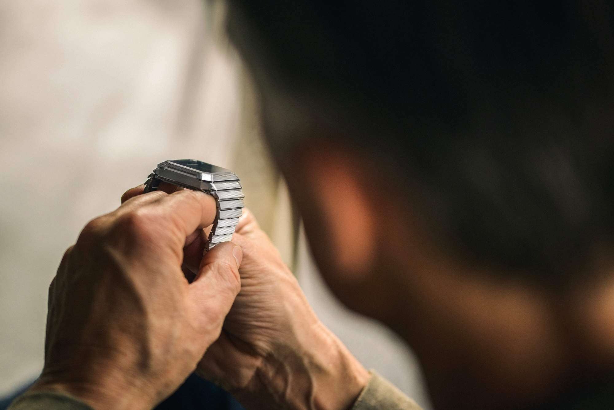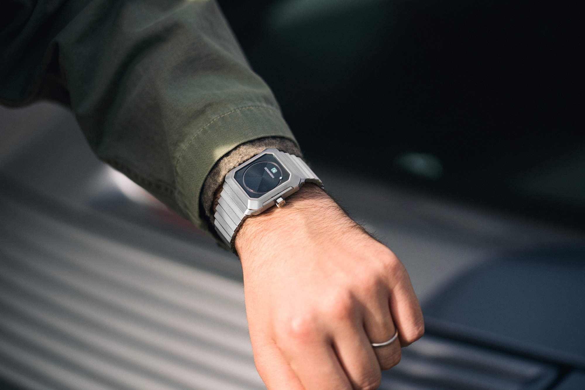 The case sets the tone. Steel, tiered, and sharply broken by planes that catch light like a small cubist façade. Dimensions are 36.0 x 43.8 x 11.3 mm, with a bevelled rectangular sapphire up front and a sapphire back. Water resistance is 5 ATM. The integrated steel bracelet continues the geometry with cascading links that taper for comfort and visual flow, secured by a folding clasp with micro-adjust and a quick-release system.