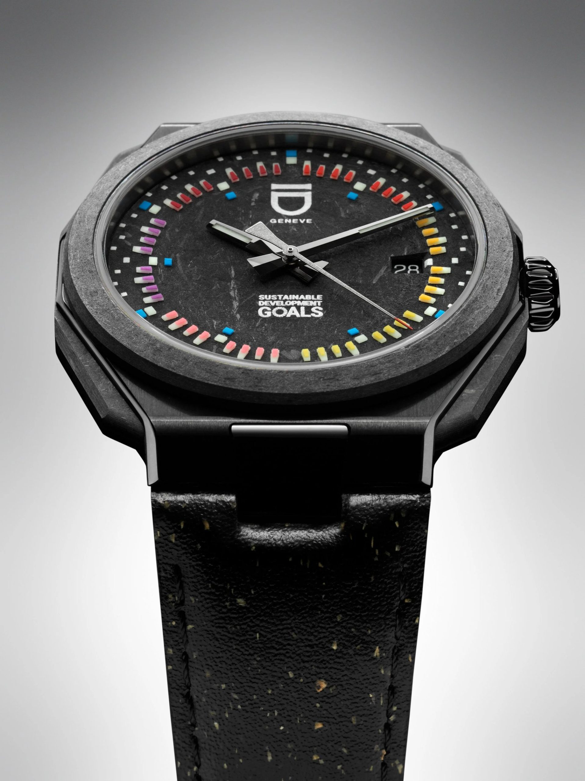 The material story is the spine here. A regenerative carbon bezel and dial developed with CompPair. A case in 100% reprocessed stainless steel. A 70% recycled sapphire crystal engraved with all 17 SDG entities. Inside ticks a refurbished Swiss automatic movement drawn from historical stock. Swiss standards, minimal impact, with parts chosen for circularity rather than novelty.