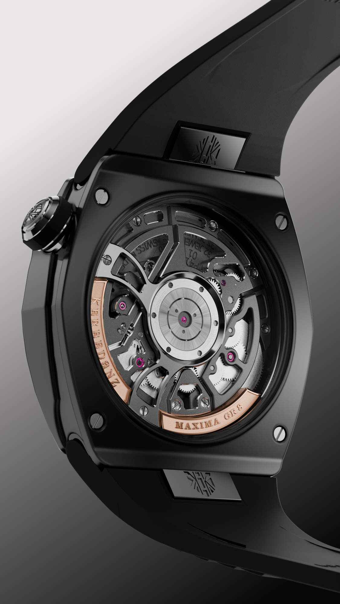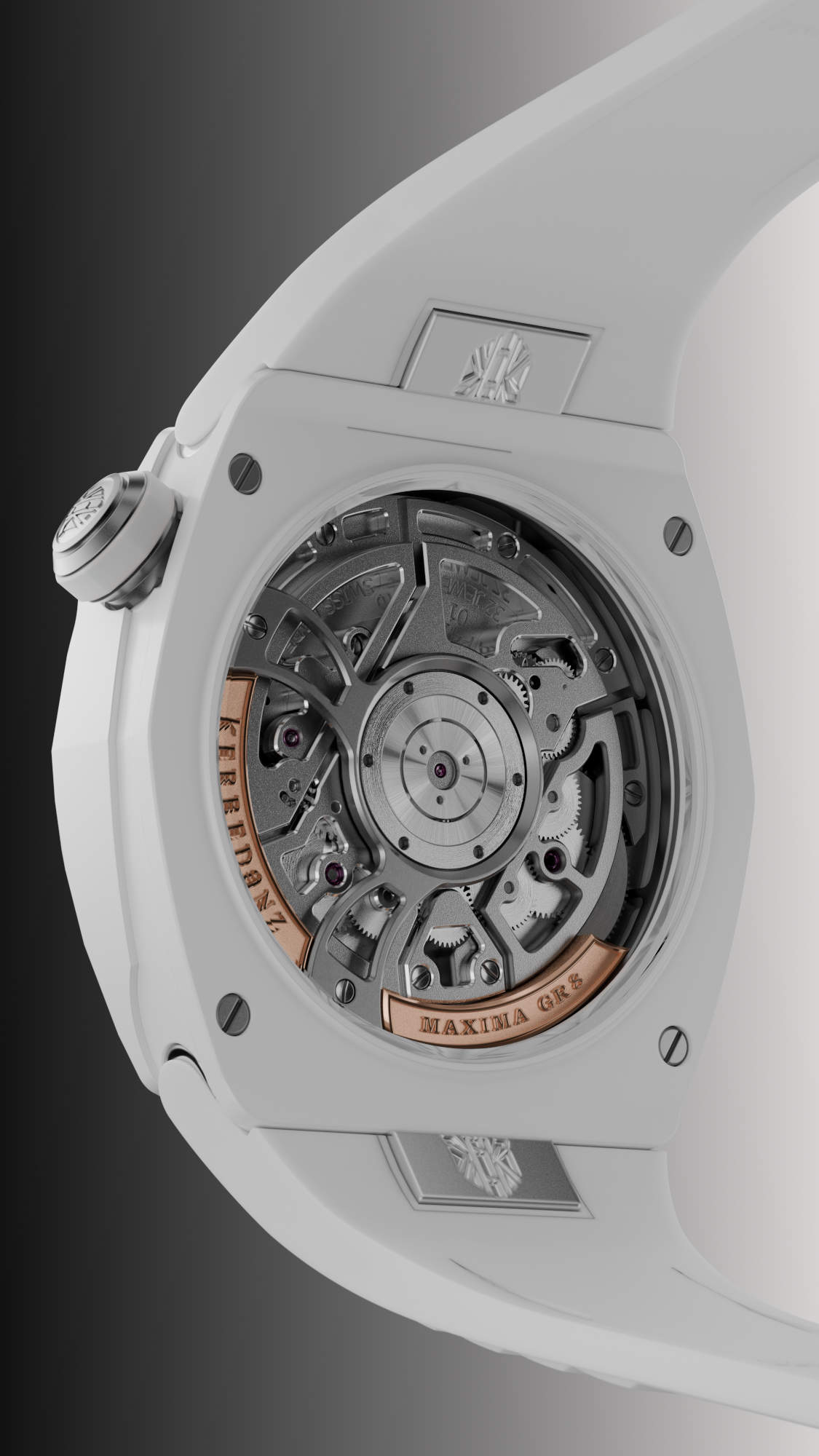 Ceramic brings tangible gains – hardness, scratch resistance, and lightness. The black case wears a stealth-like matte character, the white case a crisp modern polish. Surfaces are carefully finished to underline the Maxima GR8’s architectural form rather than distract from it.