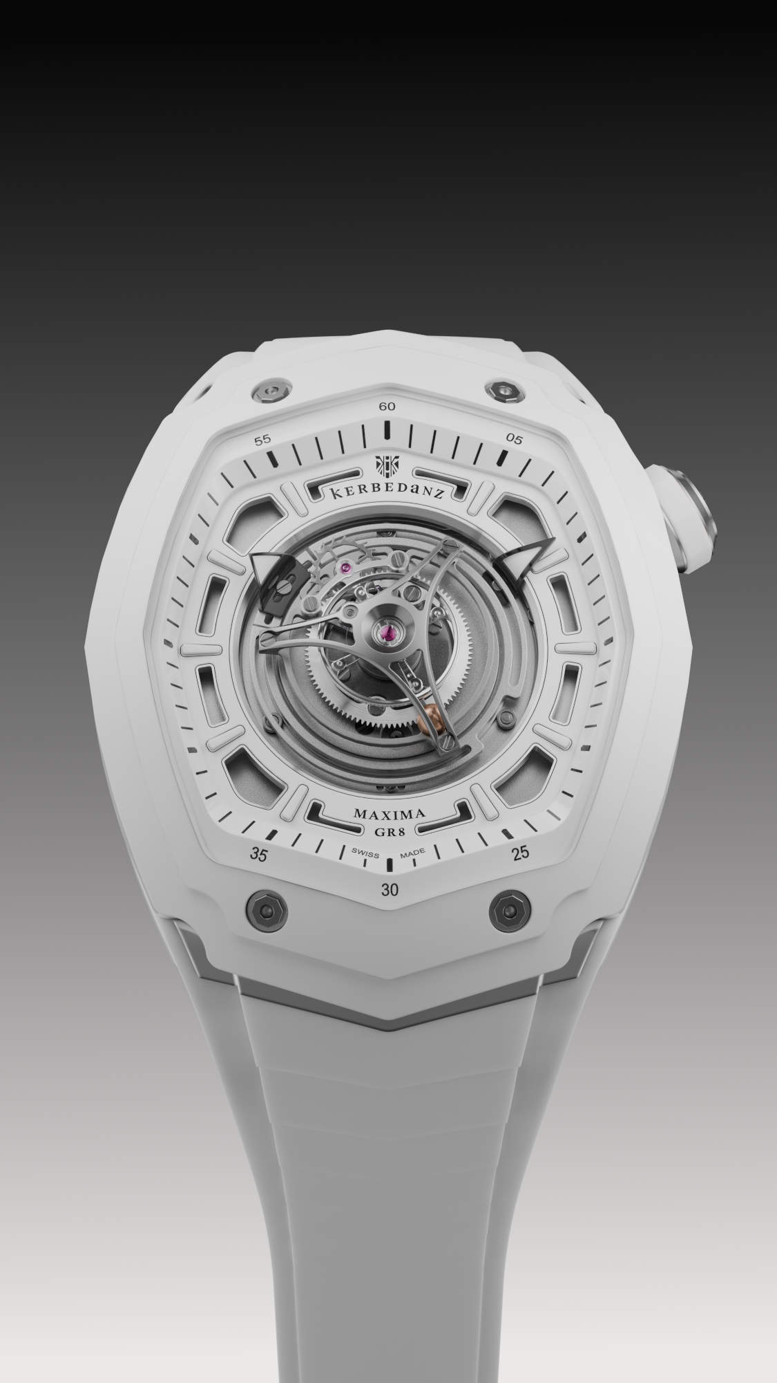 Kerbedanz unveils two Maxima GR8 39mm editions in high-performance ceramic, one in deep black and one in luminous white, each built around a central flying tourbillon. The concept is simple and effective – contrast as balance, mechanics as the quiet center.