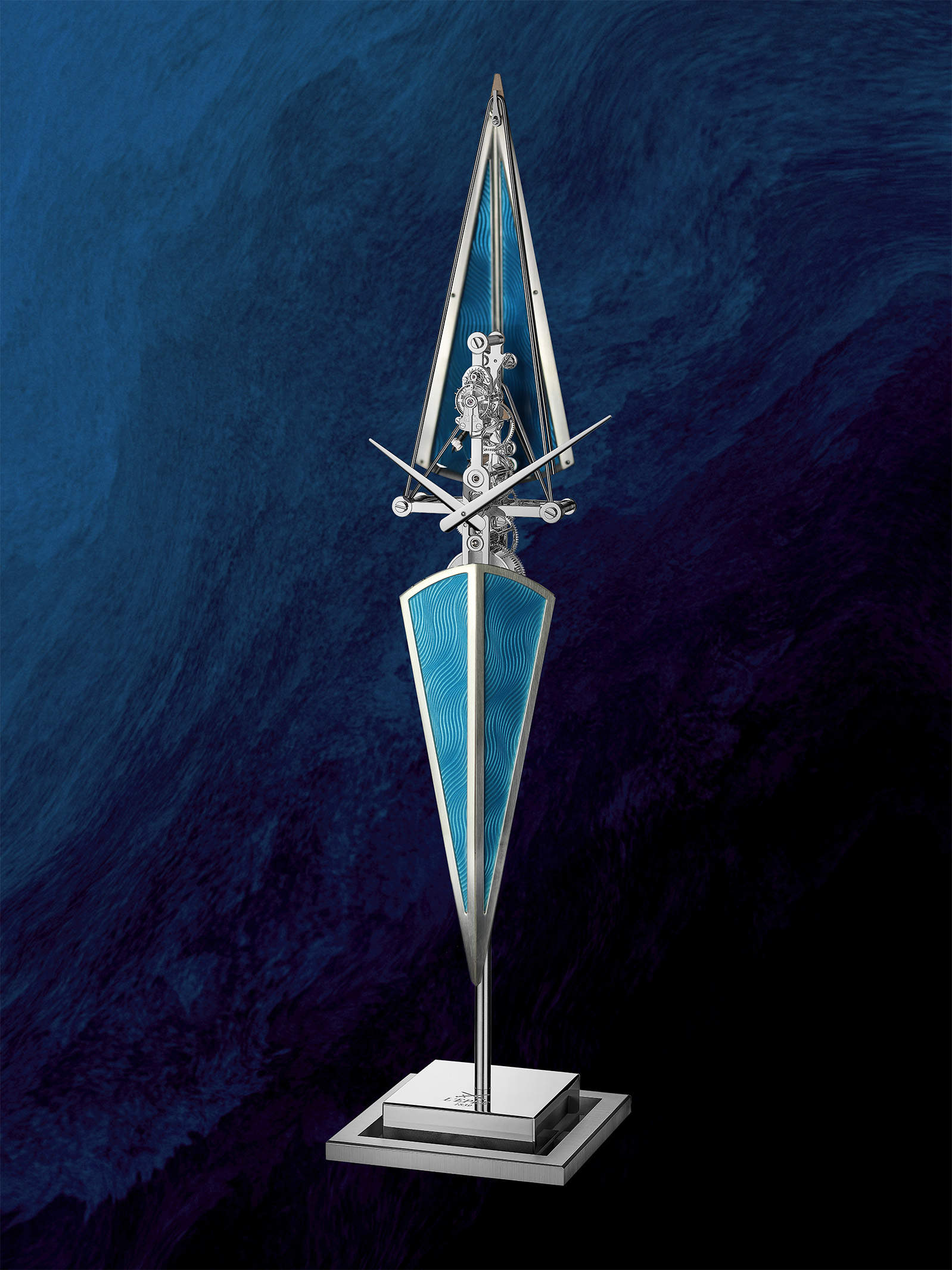 Three interpretations sketch different waters. La Regatta Umi – Sea in Japanese – uses cloisonné with paillons. Ultra-fine gold wires draw the waves, while thin silver leaves under transparent enamel catch light like spray. The reference to Hokusai is clear, but the voice remains the clock’s own. La Regatta Blue Horizon returns to minimalism through flinqué, where guilloché lies beneath translucent blue and shifts gently with the light. La Regatta Prism turns to plique-à-jour, a lattice of enamel without backing that glows like stained glass, the geometry echoing both mechanical rigor and the sport’s discipline.