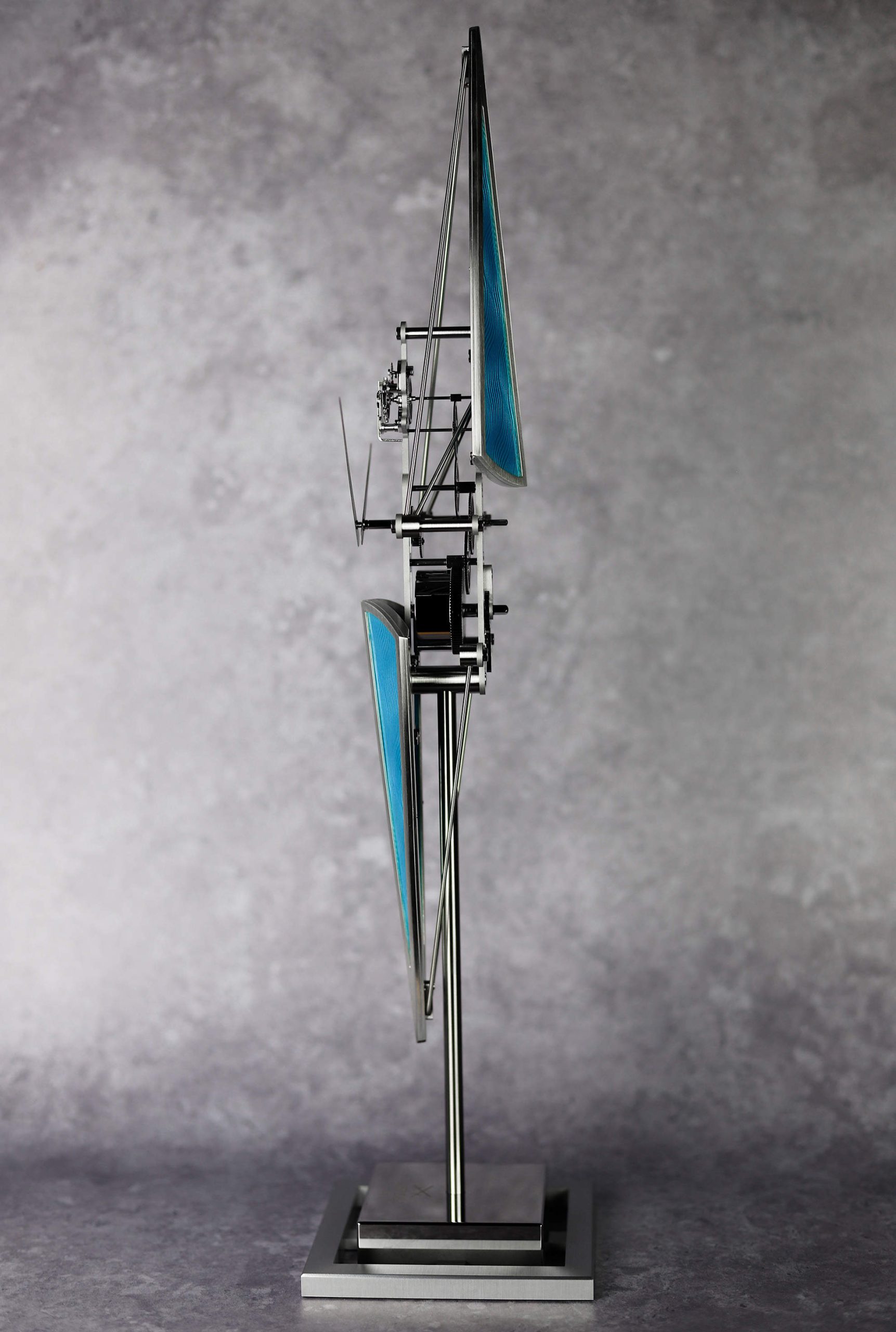 Specifications, kept honest: unique piece 1 of 1, customizable on demand. Dimensions 518 mm high, base 120 mm square. Materials palladium-plated brass, stainless steel, aluminium. The skiff elements use enamel on copper with gold wires and silver leaves. A calm object for a fast world, rowing time forward one measured stroke at a time.