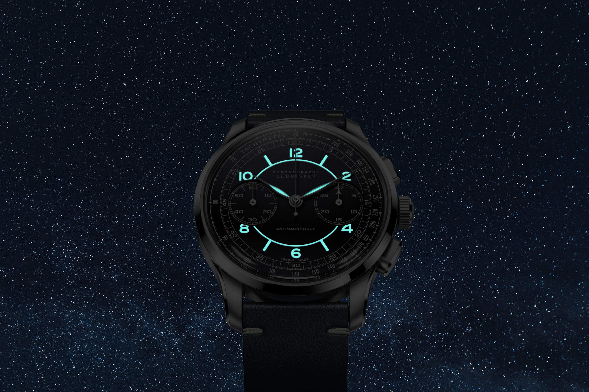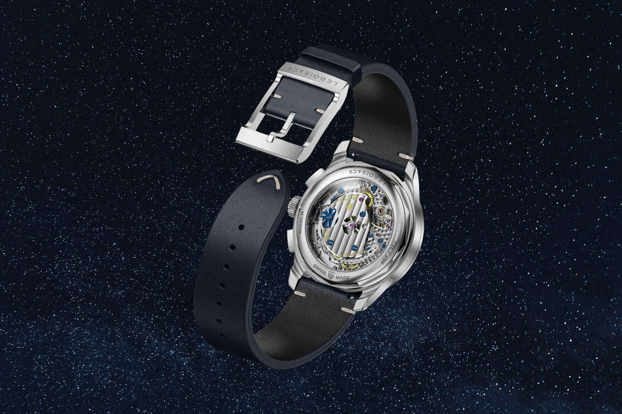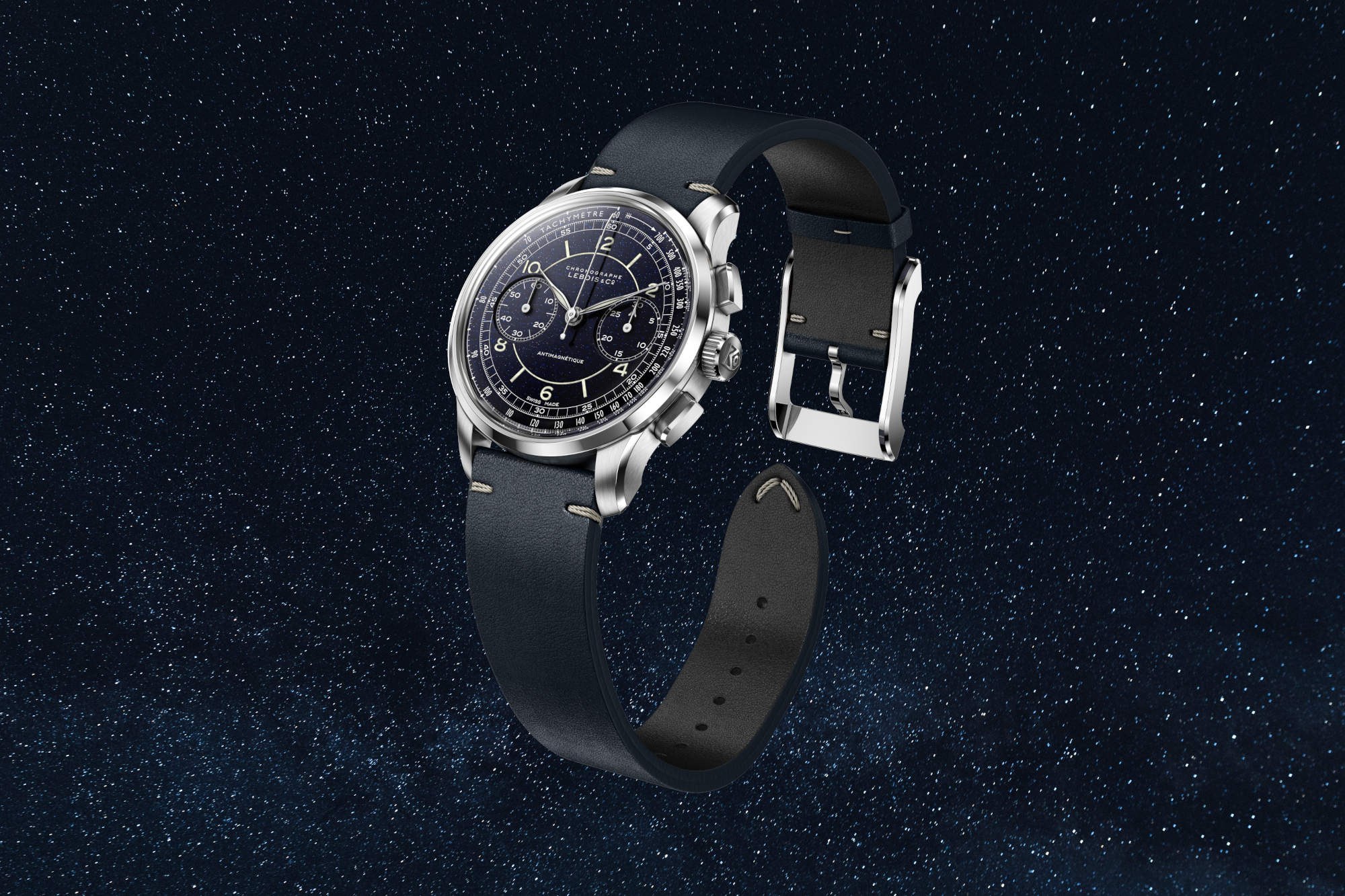 Lebois & Co’s new Heritage Sector Chronograph Aventurine treats sparkle with restraint. The dial is not a single sheet of glitter, but a constructed landscape: a rigid brass base topped by two matched aventurine layers – 0.40 mm beneath and 0.35 mm above – that allow true recessed counters without sacrificing optical depth. In daylight the surface twinkles like fine sand. Under a loupe, it reads as engineering rather than ornament.