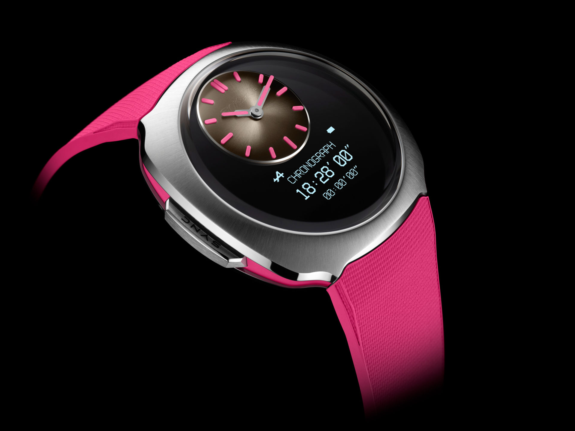 The Streamliner Alpine Mechanics Pink Edition takes a different brief. Built in steel with pink composite inserts, 42.6 mm by 14.4 mm, and also rated to 12 ATM, it blends an analogue heart with a digital soul. The calibre DI0, developed with Sequent, brings a sapphire dial with a digital display and a small grey fumé dial at 12 o’clock carrying pink indices and a transparent lacquer logo. The feature set is unapologetically practical: hours and minutes, GMT with country selector, chronograph to 1⁄100 second, perpetual calendar, and a Race mode with upcoming races, countdowns, and team alerts. A SYNC button at 9 o’clock engages race mode, with additional pushers at 2, 3, and 4. Bluetooth Low Energy 5.3 supports iOS and Android. Accuracy is quoted at ±0.3 s per day, with up to 12 months of power for time indication. Limited to 70 pieces.