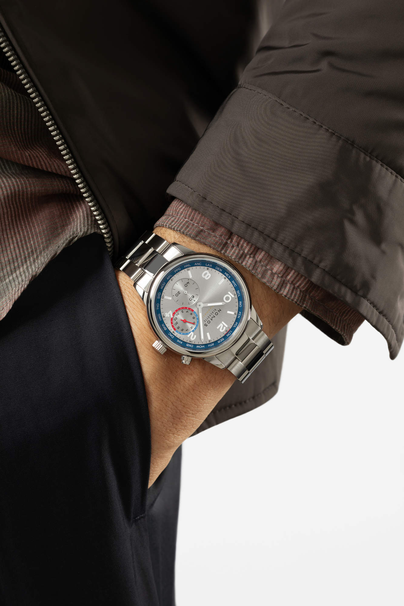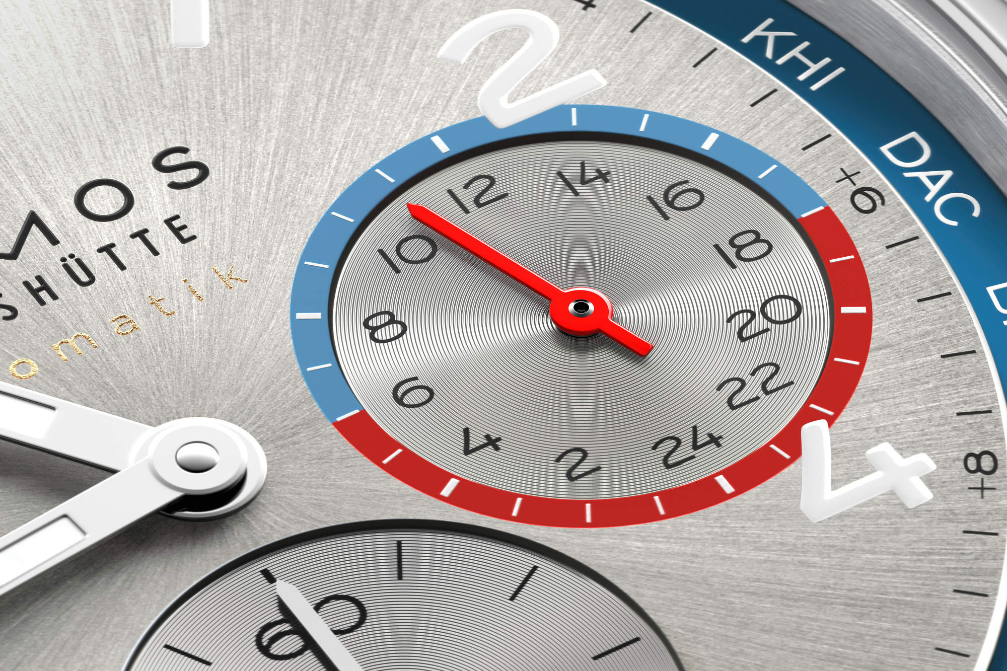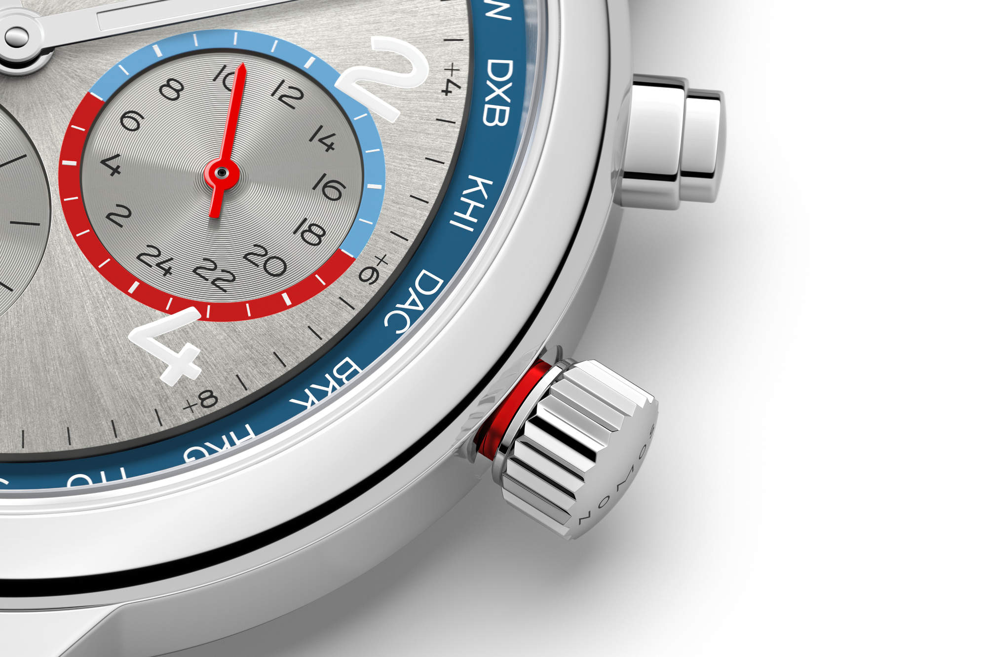 Design clarity helps the mechanics breathe. A rhodium-plated sunburst dial, blue city disc, and a red home-time cue keep the display legible. The pusher at 2 o’clock advances time zones in one-hour steps. Home time sits on a subdial at 3 o’clock, with a red 24-hour hand to mark day and night – a small kindness to frequent travelers.