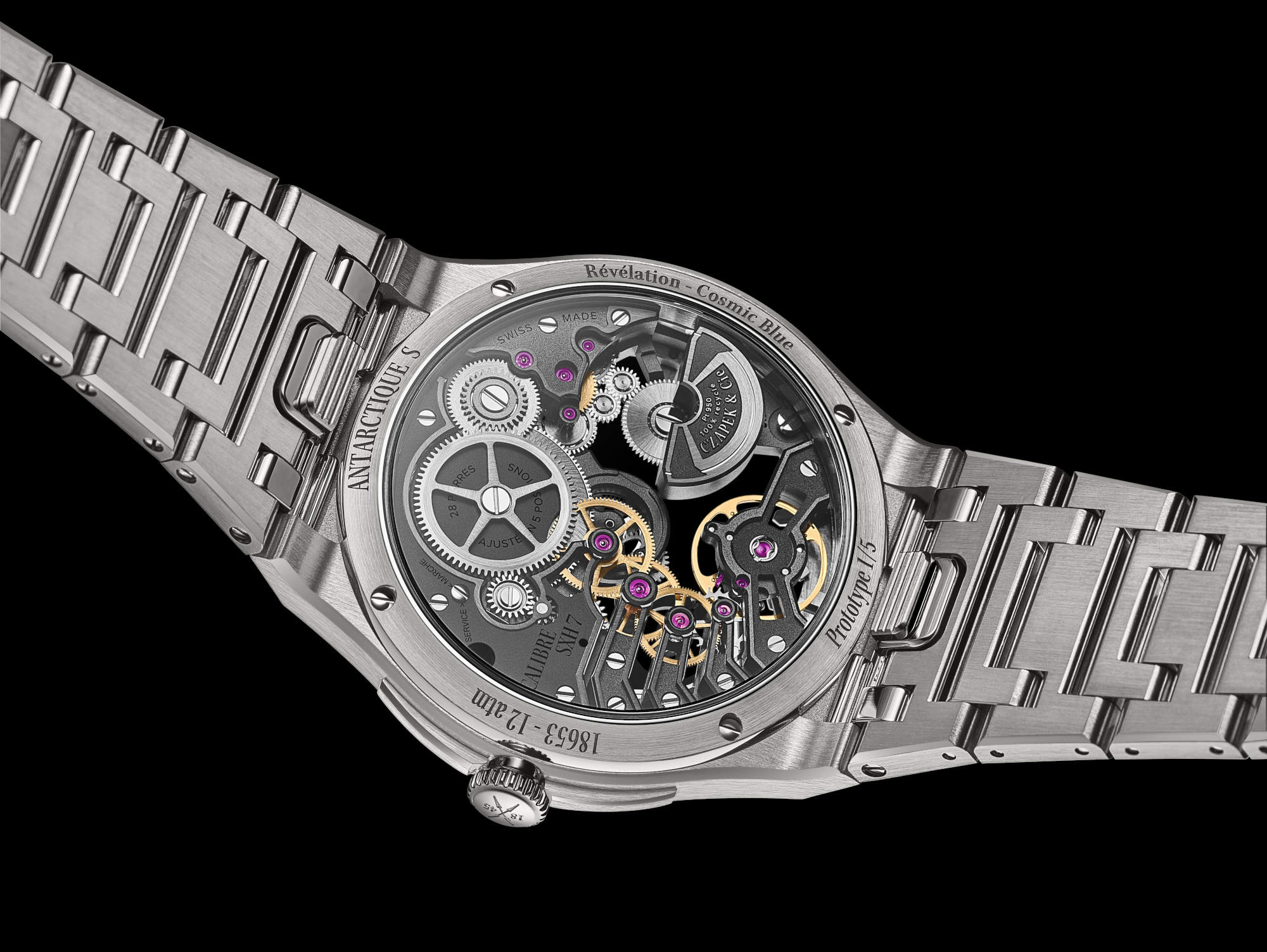 Antarctique Révélation Titanium Cosmic Blue turns the movement outward. Calibre SXH7 re-engineers SXH5 for the dial side: reversed escapement and visible stop seconds, a smoked sapphire track for timekeeping, and a small seconds at 4:30 to preserve transparency. The blue peripheral ring anchors legibility against the lattice of bridges and wheels. Offered in 40.5 mm and 38.5 mm S, with annual production up to 50 and 25 pieces. Price: CHF 42,000.
