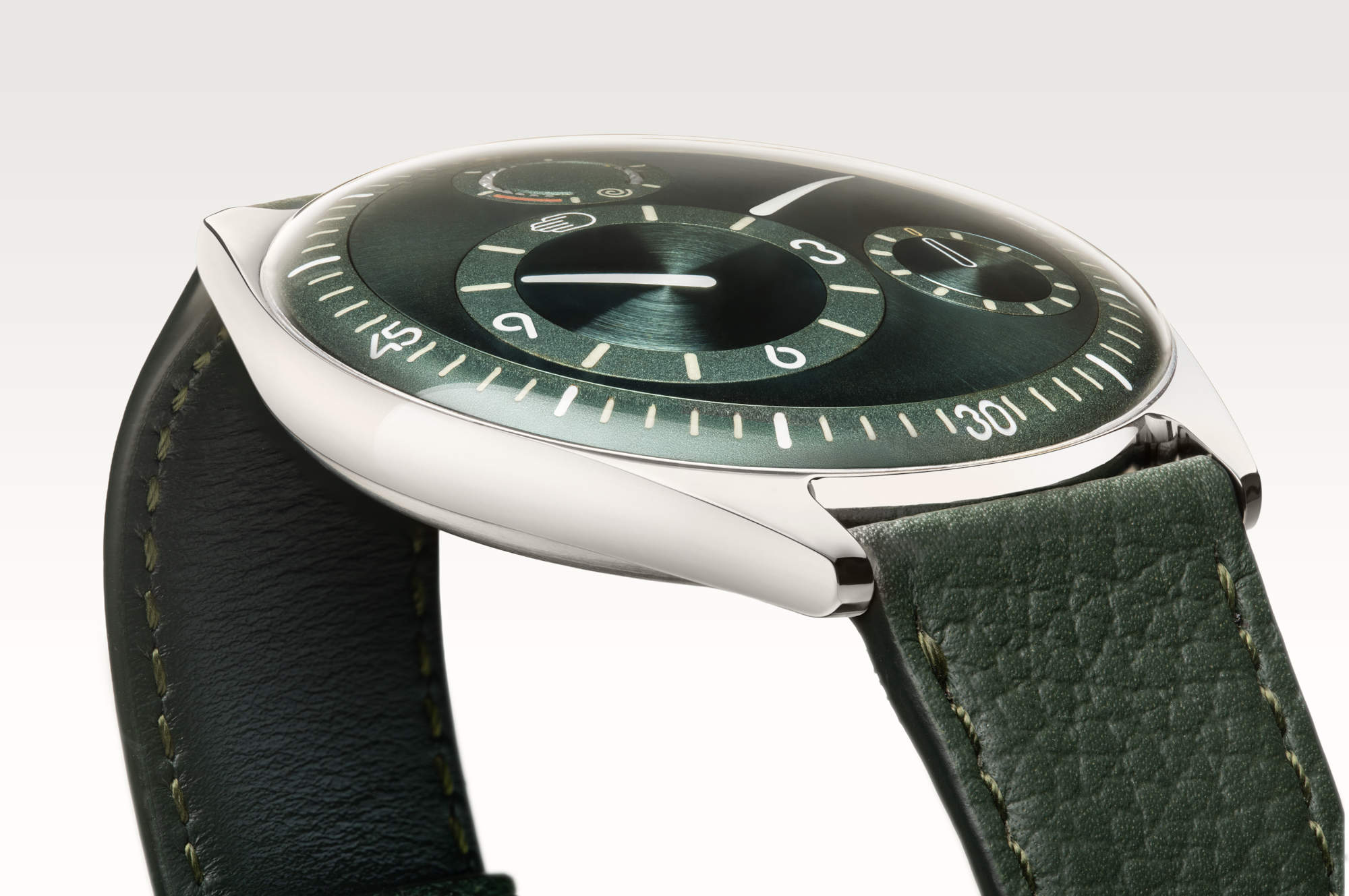 The case is Grade 5 titanium, pebble-shaped with classical lugs, 41 mm by 11 mm with a 45 mm lug-to-lug. A domed sapphire crowns a convex titanium dial where the ROCS discs carry hours, minutes, seconds, and power reserve – no hands, no crown, no conventional indices. Engravings are filled with Grade A Super-LumiNova®. Water resistance is 3 ATM, sufficient for daily life but not for bravado at the pool.