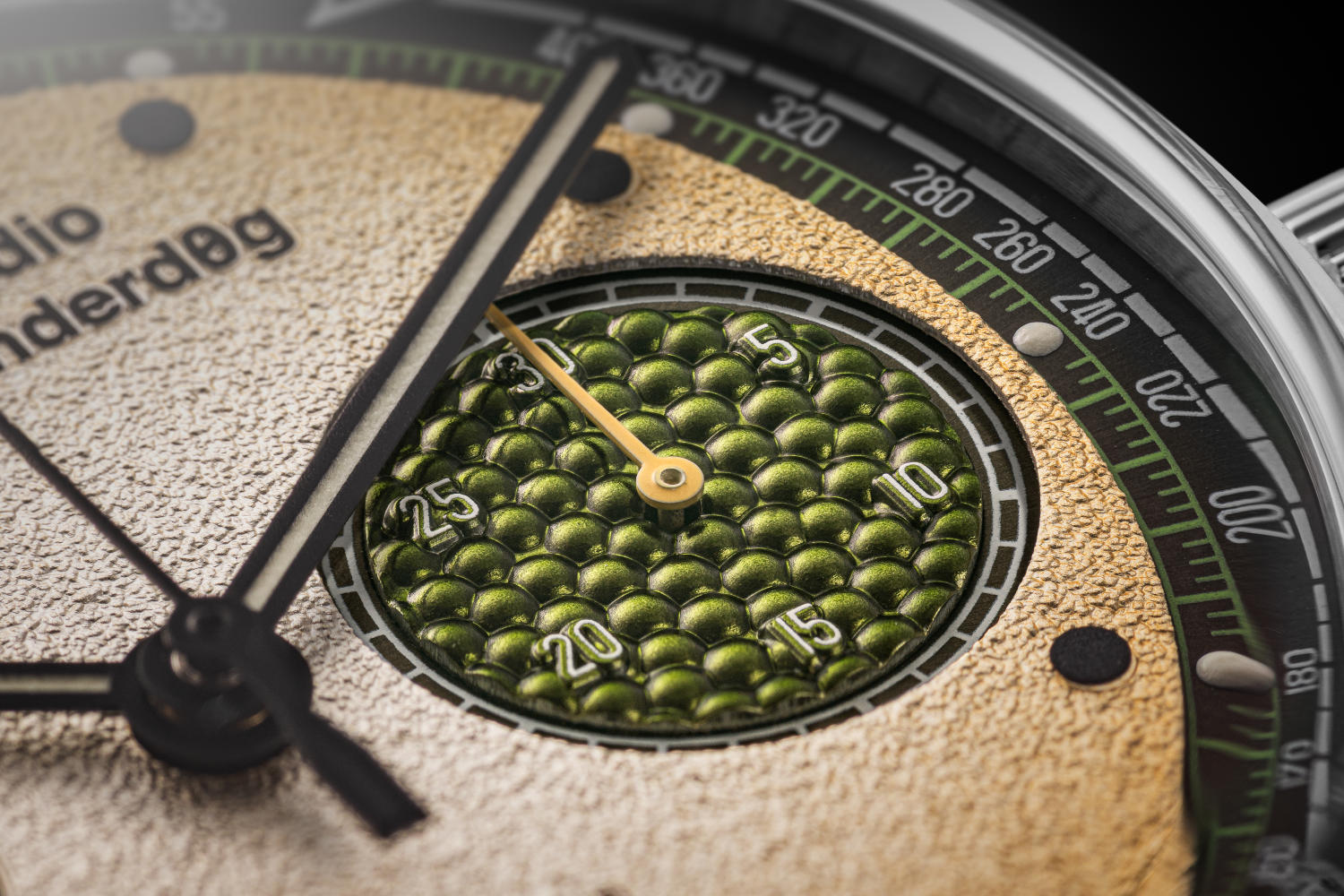 The star of the show is the oversized subdial at three o’clock, which has been cleverly machined to look like a generous serving of caviar. It’s the kind of detail that makes you do a double-take. The varied sizes of the subdials could have looked messy, but Studio Underd0g balances everything with strategic co-branding placement, letting the chronograph seconds hand sweep freely across the dial.
