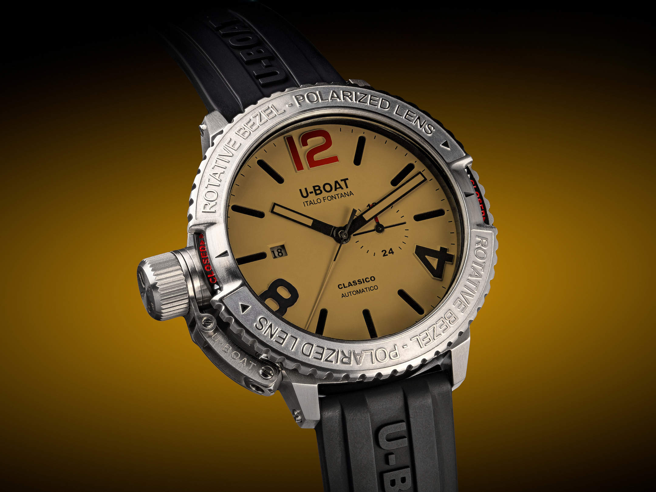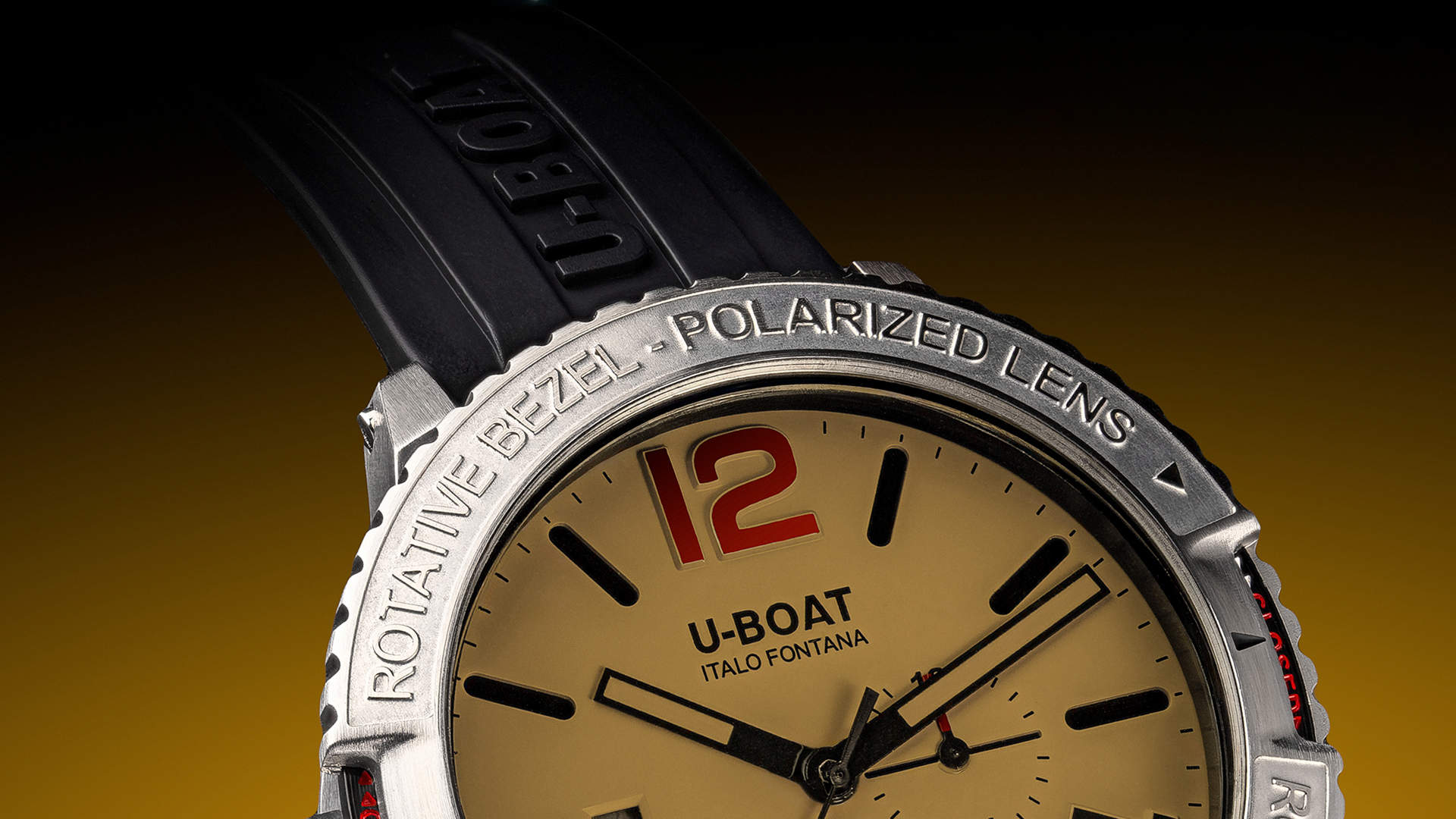 The 47 mm case carries the familiar Classico presence, offered in satin-finished steel or a black DLC execution. Around it, an engraved bezel states its purpose with raised text: “Rotative Bezel – Polarized Lens”. The left-side crown cover remains a practical U-Boat signature, leaving the wrist unencumbered.