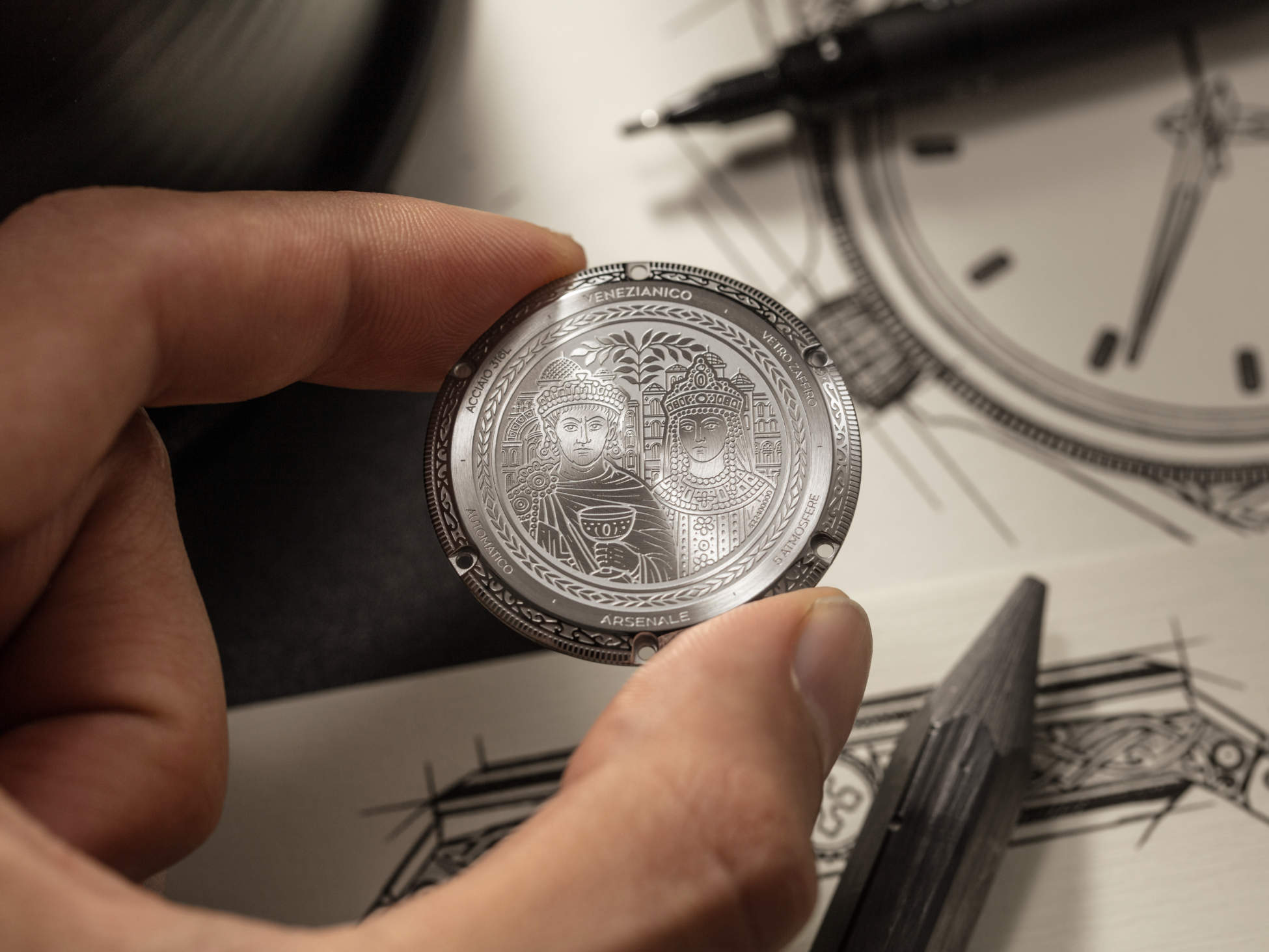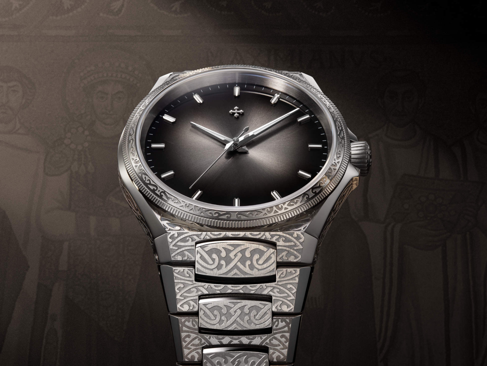 Ready to make a statement with more than just a stylish accessory? Venezianico has done it again with the Arsenale Bizantino, a harmonious blend of ancient artistry and modern design. This 40 mm engraved steel masterpiece draws its inspiration from the geometric elegance of Byzantine art, right from the heart of Constantinople.